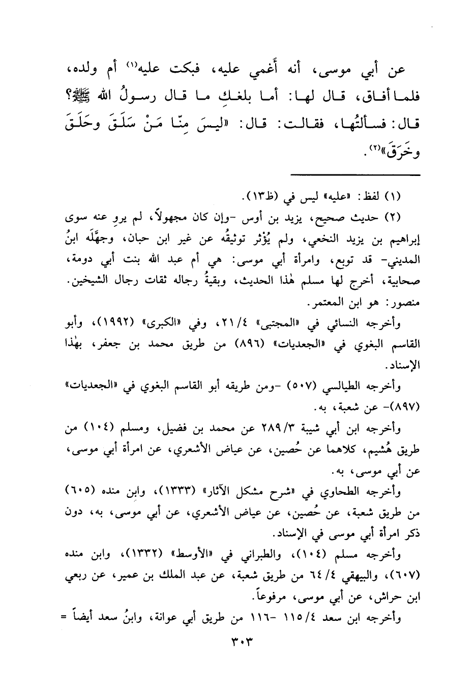 عَنْ أَبِي مُوسَى أَنَّهُ أُغْمِيَ عَلَيْهِ، فَبَكَتْ عَلَيْهِ (١) أُمُّ وَلَدِهِ، فَلَمَّا أَفَاقَ قَالَ لَهَا: أَمَا بَلَغَكِ مَا قَالَ رَسُولُ اللهِ صَلَّى اللهُ عَلَيْهِ وَسَلَّمَ؟ قَالَ: فَسَأَلْتُهَا فَقَالَتْ: قَالَ: " لَيْسَ مِنَّا مَنْ سَلَقَ، وحَلَقَ وَخَرَقَ " (٢)