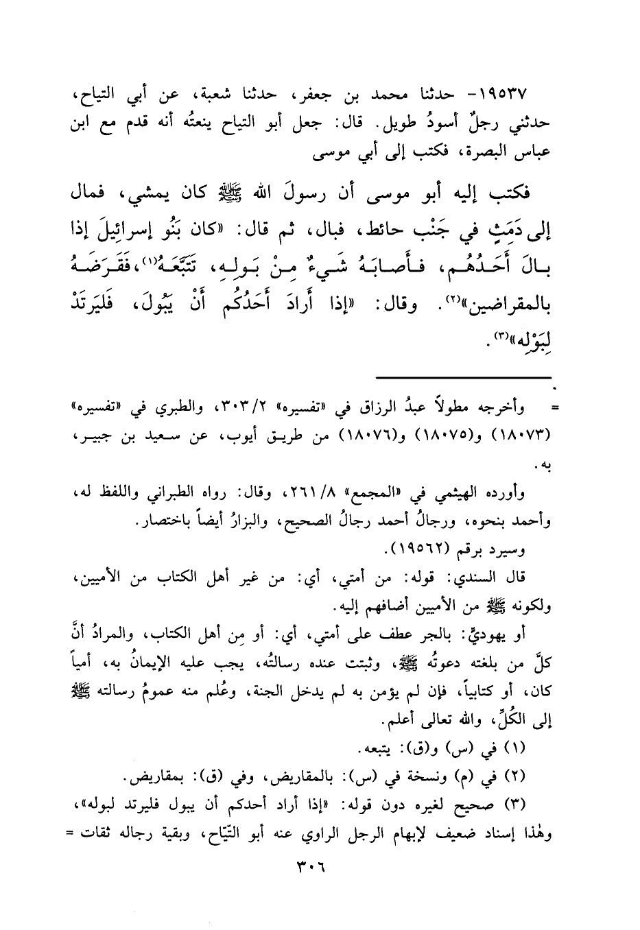 ١٩٥٣٧ - حَدَّثَنَا مُحَمَّدُ بْنُ جَعْفَرٍ، حَدَّثَنَا شُعْبَةُ، عَنْ أَبِي التَّيَّاحِ، حَدَّثَنِي رَجُلٌ أَسْوَدُ طَوِيلٌ قَالَ:، جَعَلَ أَبُو التَّيَّاحِ يَنْعَتُهُ أَنَّهُ قَدِمَ مَعَ ابْنِ عَبَّاسٍ الْبَصْرَةَ فَكَتَبَ إِلَى أَبِي مُوسَى، فَكَتَبَ إِلَيْهِ أَبُو مُوسَى، أَنَّ رَسُولَ اللهِ صَلَّى اللهُ عَلَيْهِ وَسَلَّمَ كَانَ يَمْشِي فَمَالَ إِلَى دَمْثٍ فِي جَنْبِ حَائِطٍ فَبَالَ، ثُمَّ قَالَ: " كَانَ بَنَو إِسْرَائِيلَ إِذَا بَالَ أَحَدُهُمْ، فَأَصَابَهُ شَيْءٌ مِنْ بَوْلِهِ تَتْبَعُهُ (١) فَقَرَضَهُ بِالْمِقْرَاضَيْنِ " (٢) . وَقَالَ: " إِذَا أَرَادَ أَحَدُكُمْ أَنْ يَبُولَ فَلْيَرْتَدْ لِبَوْلِهِ " (٣)