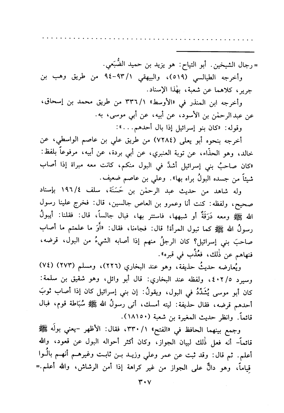 وله شاهد من حديث عبد الرحمن بن حَسَنَة، سلف ٤/١٩٦ بإسناد صحيح، ولفظه: كنت أنا وعمرو بن العاص جالسين، قال: فخرج علينا رسول الله صَلَّى اللهُ عَلَيْهِ وَسَلَّمَ ومعه درَقَةٌ أو شبهها، فاستتر بها، فبال جالساً، قال: فقلنا: أيبولُ رسولُ الله صَلَّى اللهُ عَلَيْهِ وَسَلَّمَ كما تبول المرأة! قال: فجاءنا، فقال: "أَوَ ما علمتم ما أصاب صاحبَ بني إسرائيل؟ كان الرجلُ منهم إذا أصابه الشيءُ من البول، قرضه، فنهاهم عن ذلك، فعُذب في قبره".