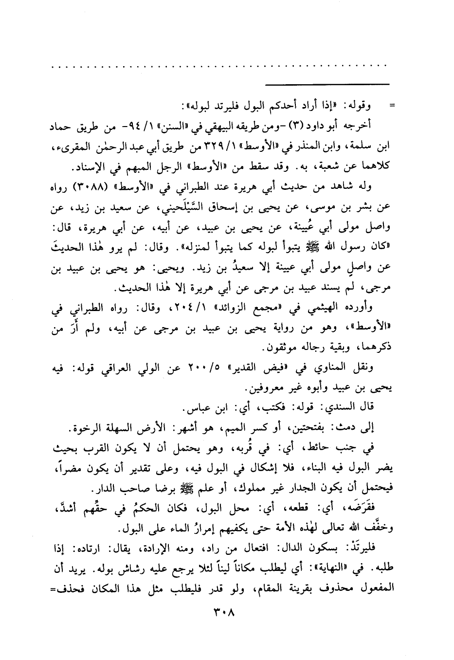 "كان رسول الله صَلَّى اللهُ عَلَيْهِ وَسَلَّمَ يتبوأ لبوله كما يتبوأ لمنزله". وقال: لم يرو هذا الحديثَ عن واصلٍ مولى أبي عيينة إلا سعيدُ بن زيد. ويحيى: هو يحيى بن عبيد بن مرجى، لم يسند عبيد بن مرجى عن أبي هريرة إلا هذا الحديث.