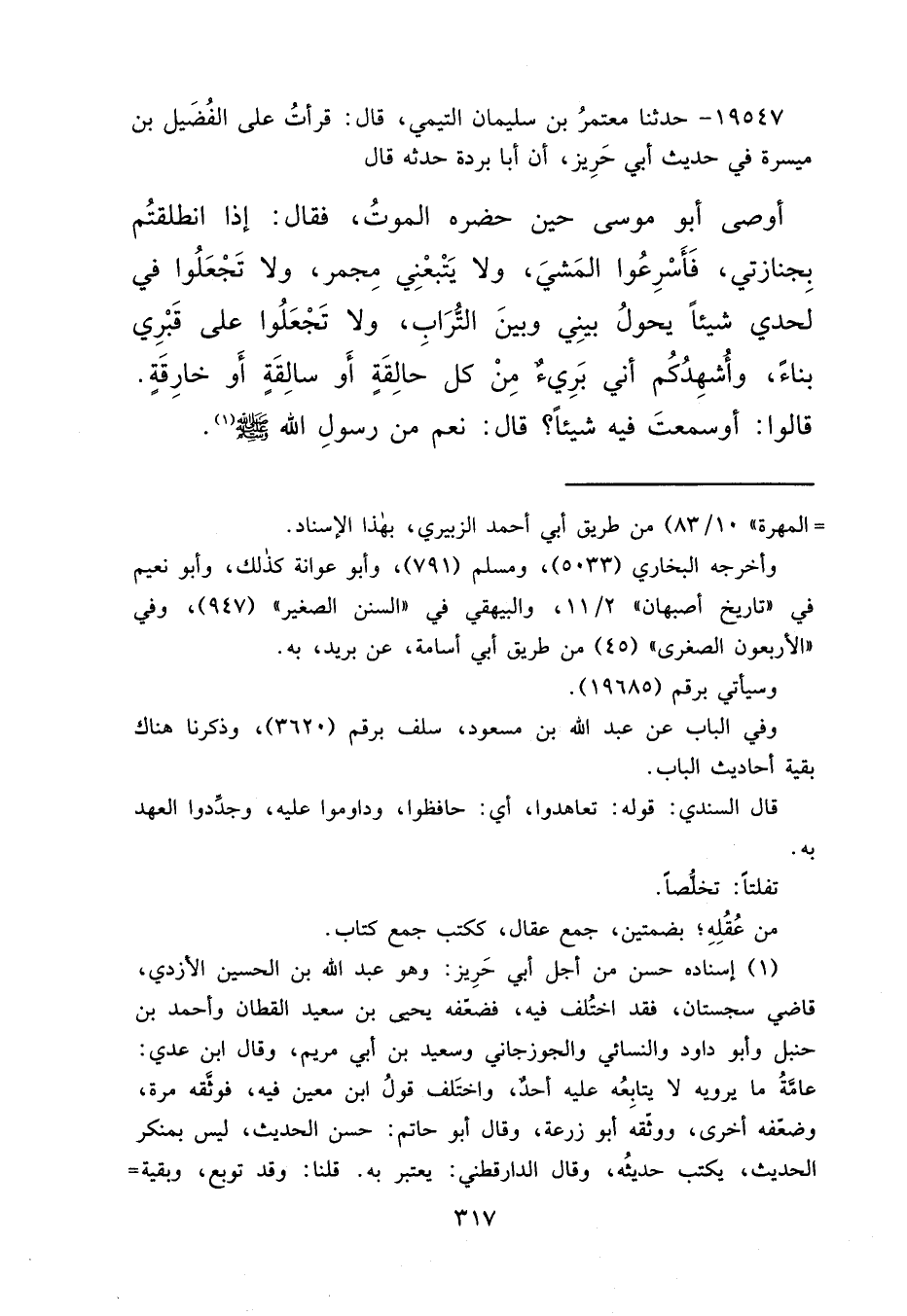 ١٩٥٤٧ - حَدَّثَنَا مُعْتَمِرُ بْنُ سُلَيْمَانَ التَّيْمِيُّ قَالَ: قَرَأْتُ عَلَى الْفُضَيْلِ بْنِ مَيْسَرَةَ فِي حَدِيثَ أَبِي حَرِيزٍ، أَنَّ أَبَا بُرْدَةَ حَدَّثَهُ قَالَ: أَوْصَى أَبُو مُوسَى حِينَ حَضَرَهُ الْمَوْتُ فَقَالَ: إِذَا انْطَلَقْتُمْ بِجِنَازَتِي فَأَسْرِعُوا الْمَشْيَ، وَلَا يَتَّبِعُنِي مُجَمَّرٌ، وَلَا تَجْعَلُوا فِي لَحْدِي شَيْئًا يَحُولُ بَيْنِي وَبَيْنَ التُّرَابِ، وَلَا تَجْعَلُوا عَلَى قَبْرِي بِنَاءً. " وَأُشْهِدُكُمْ أَنِّي بَرِيءٌ مِنْ كُلِّ حَالِقَةٍ أَوْ سَالِقَةٍ أَوْ خَارِقَةٍ قَالُوا أَوَسَمِعْتَ فِيهِ شَيْئًا؟ قَالَ: نَعَمْ. مِنْ رَسُولِ اللهِ صَلَّى اللهُ عَلَيْهِ وَسَلَّمَ " (١)