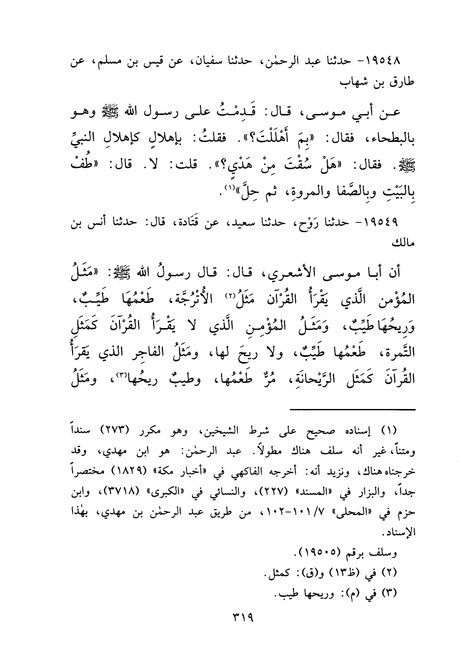 ١٩٥٤٨ - حَدَّثَنَا عَبْدُ الرَّحْمَنِ، حَدَّثَنَا سُفْيَانُ، عَنْ قَيْسِ بْنِ مُسْلِمٍ، عَنْ طَارِقِ بْنِ شِهَابٍ، عَنْ أَبِي مُوسَى قَالَ: قَدِمْتُ عَلَى رَسُولِ اللهِ صَلَّى اللهُ عَلَيْهِ وَسَلَّمَ وَهُوَ بِالْبَطْحَاءِ فَقَالَ: " بِمَ أَهْلَلْتَ؟ " فَقُلْتُ: بِإِهْلَالٍ كَإِهْلَالِ النَّبِيِّ صَلَّى اللهُ عَلَيْهِ وَسَلَّمَ: فَقَالَ: " هَلْ سُقْتَ مِنْ هَدْيٍ؟ " قُلْتُ: لَا. قَالَ: " طُفْ بِالْبَيْتِ وَبِالصَّفَا وَالْمَرْوَةِ، ثُمَّ حِلَّ " (١)