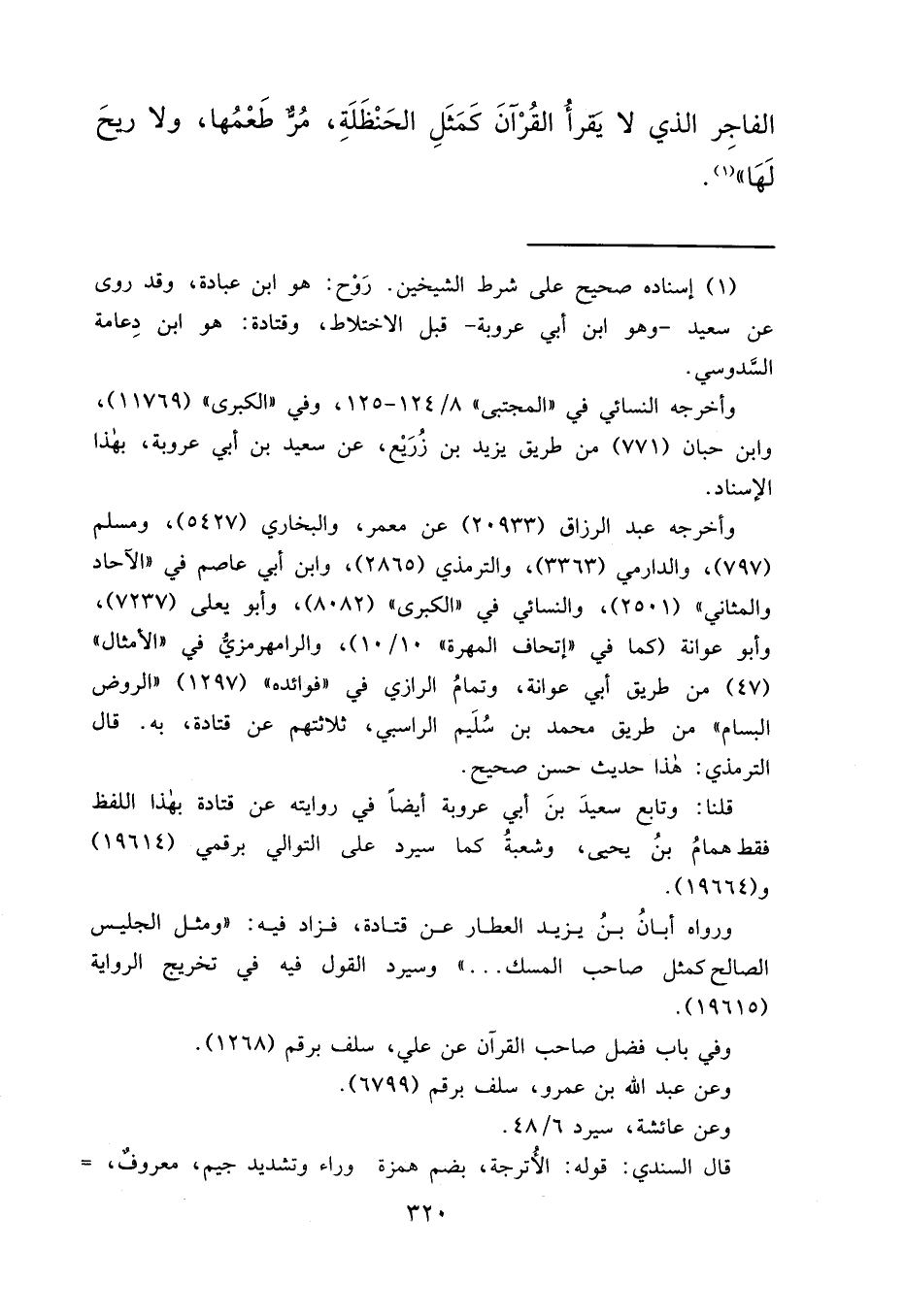 الْفَاجِرِ الَّذِي لَا يَقْرَأُ الْقُرْآنَ كَمَثَلِ الْحَنْظَلَةِ مُرٌّ طَعْمُهَا وَلَا رِيحَ لَهَا " (١)