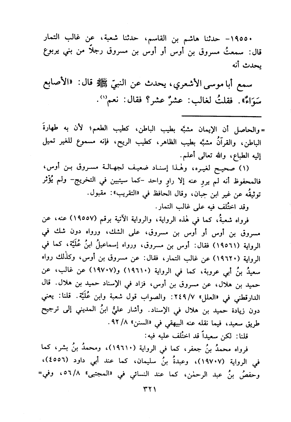 ١٩٥٥٠ - حَدَّثَنَا هَاشِمُ بْنُ الْقَاسِمِ، حَدَّثَنَا شُعْبَةُ، عَنْ غَالِبٍ التَّمَّارِ قَالَ سَمِعْتُ مَسْرُوقَ بْنَ أَوْسٍ أَو أَوْسَ بْنَ مَسْرُوقٍ رَجُلًا مِنْ بَنِي يَرْبُوعٍ يُحَدِّثُ، أَنَّهُ سَمِعَ أَبَا مُوسَى الْأَشْعَرِيَّ يُحَدِّثُ عَنِ النَّبِيِّ صَلَّى اللهُ عَلَيْهِ وَسَلَّمَ قَالَ: " الْأَصَابِعُ سَوَاءٌ " فَقُلْتُ: لِغَالِبٍ: عَشْرٌ عَشْرٌ؟ فَقَالَ: نَعَمْ (١)