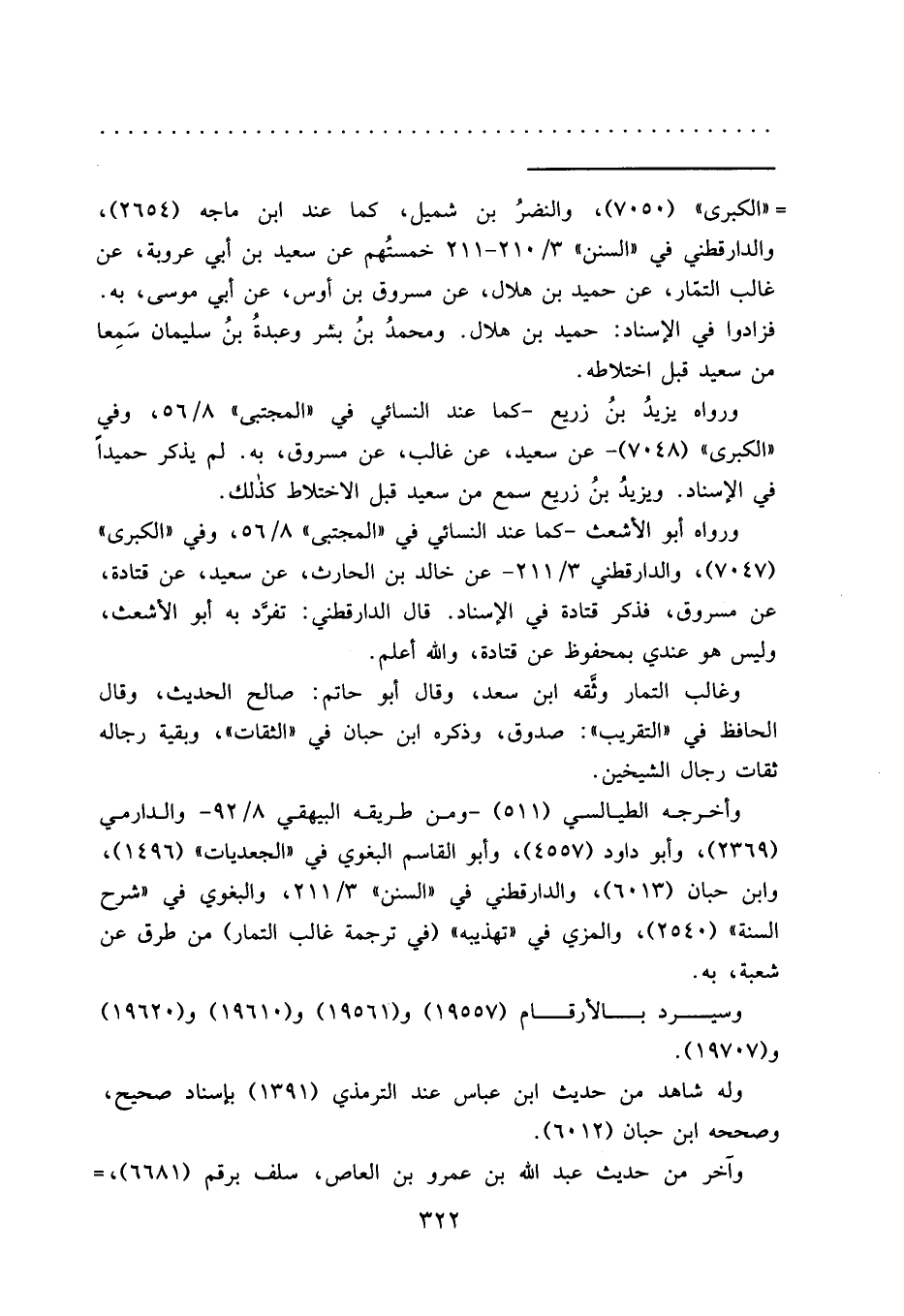 = "الكبرى" (٧٠٥٠) ، والنضرُ بن شميل، كما عند ابن ماجه (٢٦٥٤) ، والدارقطني في "السنن " ٣/٢١٠-٢١١ خمستُهم عن سعيد بن أبي عروبة، عن غالب التمّار، عن حميد بن هلال، عن مسروق بن أوس، عن أبي موسى، به.