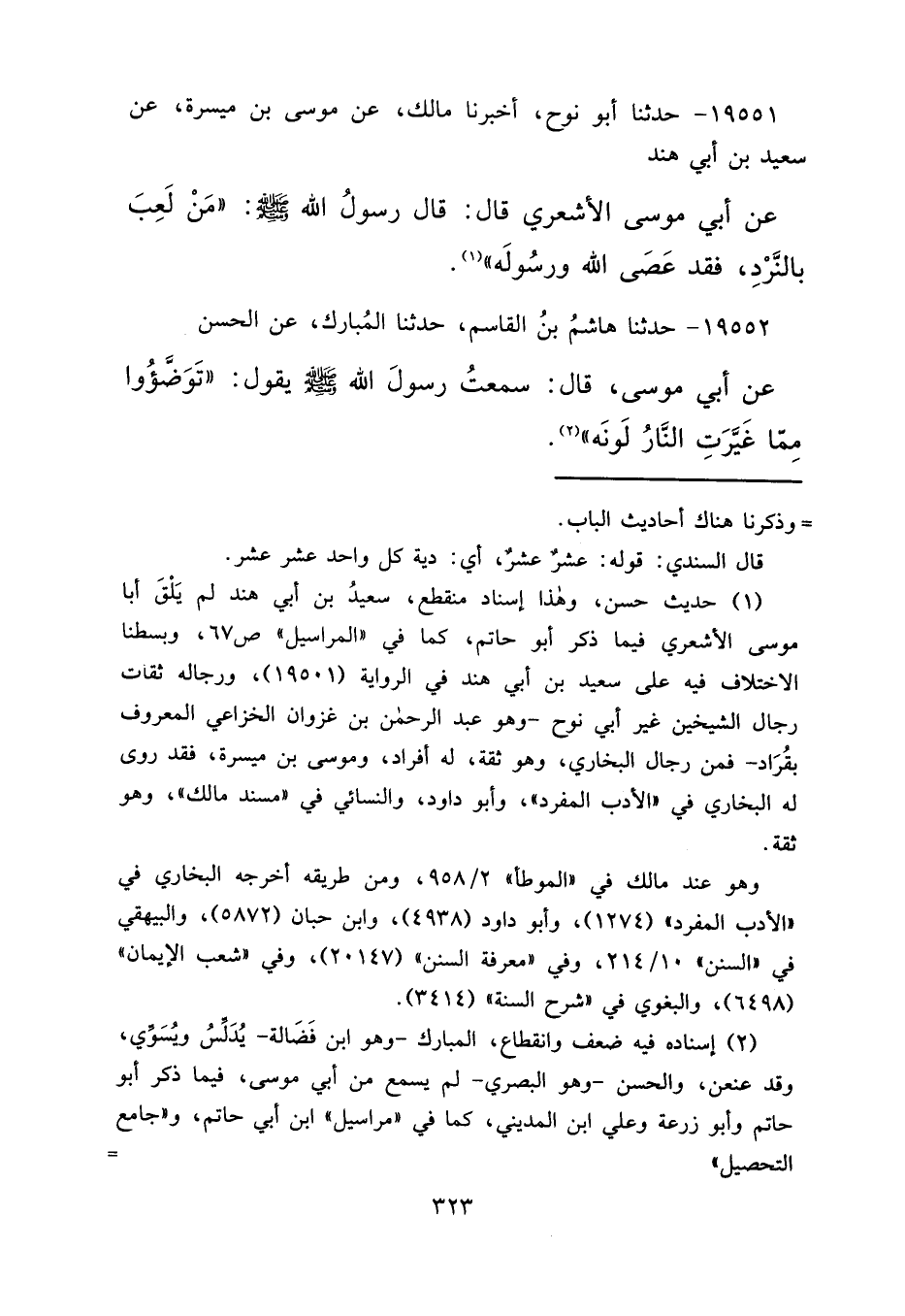 ١٩٥٥١ - حَدَّثَنَا أَبُو نُوحٍ، أَخْبَرَنَا مَالِكٌ، عَنْ مُوسَى بْنِ مَيْسَرَةَ، عَنْ سَعِيدِ بْنِ أَبِي هِنْدٍ، عَنْ أَبِي مُوسَى الْأَشْعَرِيِّ قَالَ: قَالَ رَسُولُ اللهِ صَلَّى اللهُ عَلَيْهِ وَسَلَّمَ: " مَنْ لَعِبَ بِالنَّرْدِ فَقَدْ عَصَى اللهَ وَرَسُولَهُ " (١)