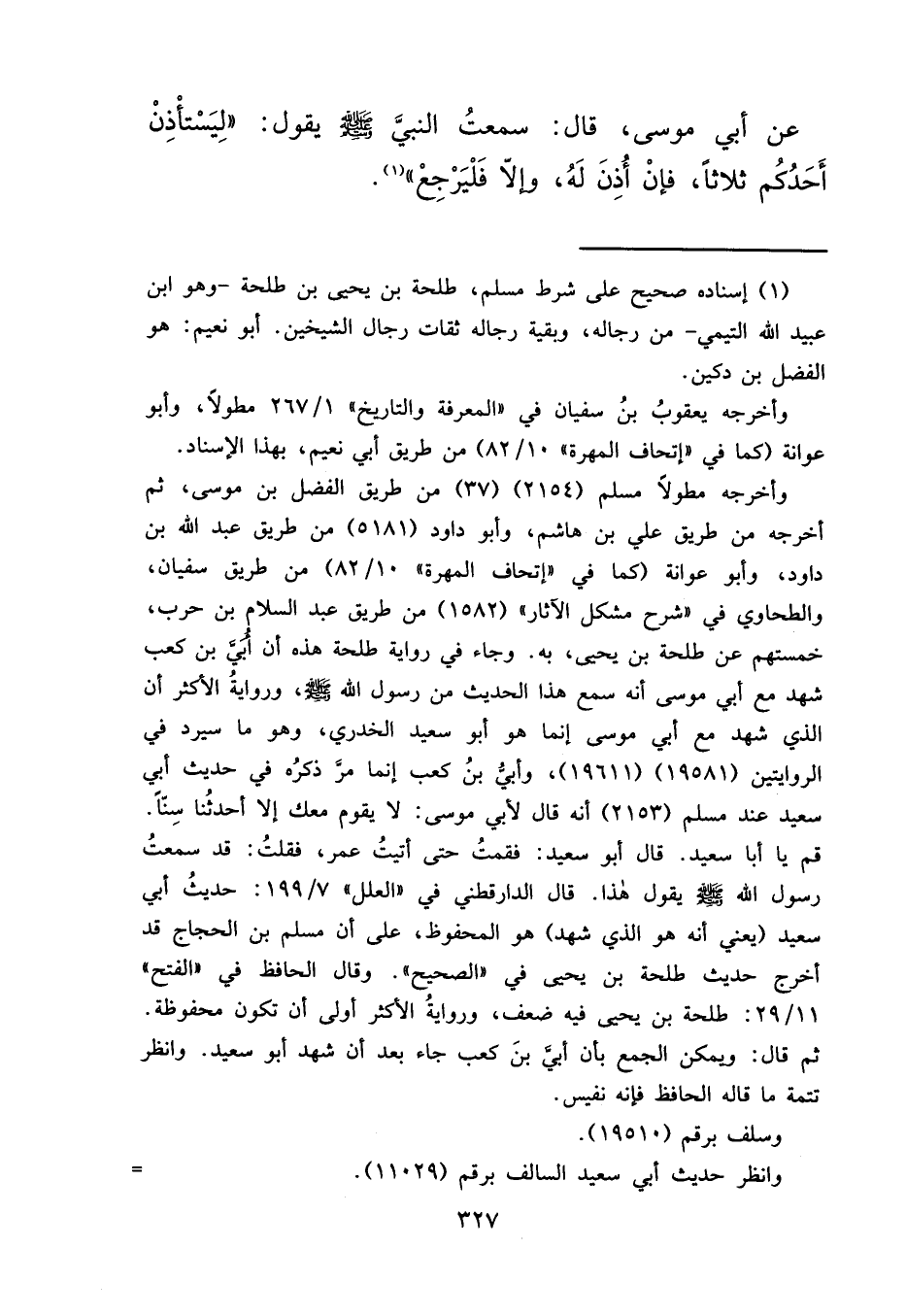 قم يا أبا سعيد. قال أبو سعيد: فقمتُ حتى أتيتُ عمر، فقلتُ: قد سمعتُ رسول الله صَلَّى اللهُ عَلَيْهِ وَسَلَّمَ يقول هذا. قال الدارقطني في "العلل" ٧/١٩٩: حديثُ أبي سعيد (يعني أنه هو الذي شهد) هو المحفوظ، على أن مسلم بن الحجاج قد أخرج حديث طلحة بن يحيى في "الصحيح". وقال الحافظ في "الفتح" ١١/٢٩: طلحة بن يحيى فيه ضعف، وروايةُ الأكثر أولى أن تكون محفوظة.