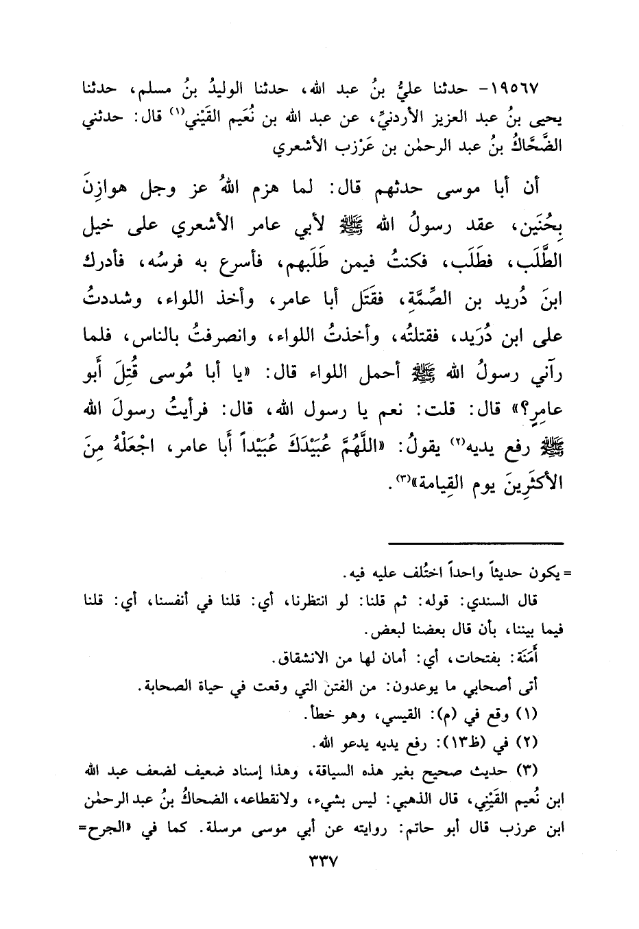 ١٩٥٦٧ - حَدَّثَنَا عَلِيُّ بْنُ عَبْدِ اللهِ، حَدَّثَنَا الْوَلِيدُ بْنُ مُسْلِمٍ، حَدَّثَنَا يَحْيَى بْنُ عَبْدِ الْعَزِيزِ الْأُرْدُنِيُّ، عَنْ عَبْدِ اللهِ بْنِ نُعَيْمٍ الْقَيْنِيِّ (١) قَالَ: حَدَّثَنِي الضَّحَّاكُ بْنُ عَبْدِ الرَّحْمَنِ بْنِ عَرْزَبٍ الْأَشْعَرِيُّ، أَنَّ أَبَا مُوسَى حَدَّثَهُمْ قَالَ: لَمَّا هَزَمَ اللهُ عَزَّ وَجَلَّ هَوَازِنَ بِحُنَيْنٍ عَقَدَ رَسُولُ اللهِ صَلَّى اللهُ عَلَيْهِ وَسَلَّمَ لِأَبِي عَامِرٍ الْأَشْعَرِيِّ عَلَى خَيْلِ الطَّلَبِ، فَطَلَبَ، فَكُنْتُ فِيمَنْ طَلَبَهُمْ، فَأَسْرَعَ بِهِ فَرَسُهُ فَأَدْرَكَ ابْنَ دُرَيْدِ بْنِ الصِّمَّةِ فَقَتَلَ أَبَا عَامِرٍ وَأَخَذَ اللِّوَاءَ. وَشَدَدْتُ عَلَى ابْنِ دُرَيْدٍ فَقَتَلْتُهُ، وَأَخَذْتُ اللِّوَاءَ وَانْصَرَفْتُ بِالنَّاسِ، فَلَمَّا رَآنِي رَسُولُ اللهِ صَلَّى اللهُ عَلَيْهِ وَسَلَّمَ أَحْمِلُ اللِّوَاءَ قَالَ: " يَا أَبَا مُوسَى قُتِلَ أَبُو عَامِرٍ؟ " قَالَ: قُلْتُ: نَعَمْ. يَا رَسُولَ اللهِ. قَالَ: فَرَأَيْتُ رَسُولَ اللهِ صَلَّى اللهُ عَلَيْهِ وَسَلَّمَ رَفَعَ يَدَيْهِ (٢) يَقُولُ: " اللهُمَّ عُبَيْدَكَ عُبَيْدًا أَبَا عَامِرٍ اجْعَلْهُ مِنَ الْأَكْثَرِينَ يَوْمَ الْقِيَامَةِ " (٣)
