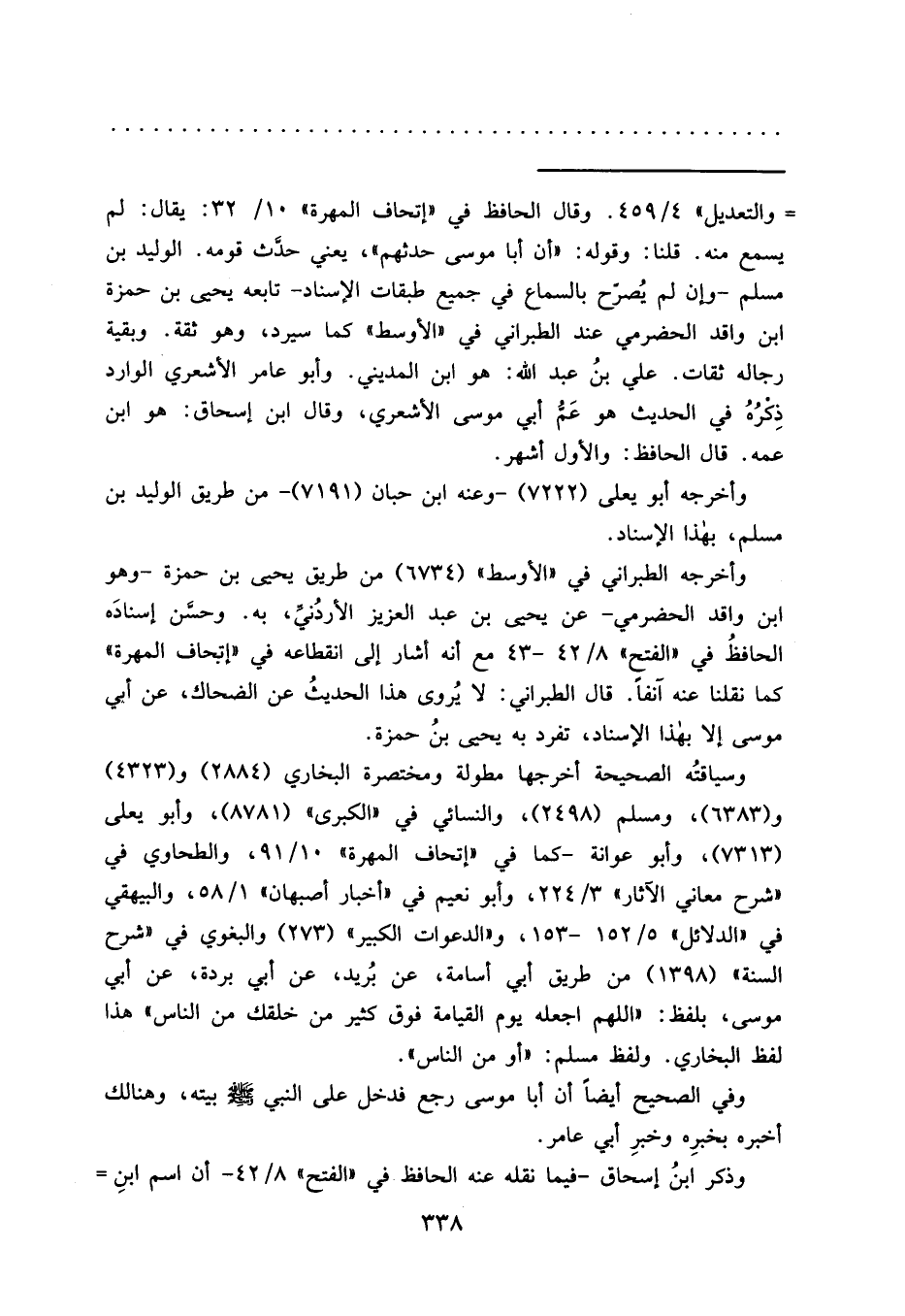 = والتعديل" ٤/٤٥٩. وقال الحافظ في "إتحاف المهرة" ١٠/٣٢: يقال: لم يسمع منه. قلنا: وقوله: "أن أبا موسى حدثهم"، يعني حدَّث قومه. الوليد بن مسلم- وإن لم يُصرح بالسماع في جميع طبقات الإسناد- تابعه يحيى بن حمزة ابن واقد الحضرمي عند الطبراني في "الأوسط" كما سيرد، وهو ثقة. وبقية رجاله ثقات. علي بنُ عبد الله: هو ابن المديني. وأبو عامر الأشعري الوارد ذِكرُهُ في الحديث هو عَمُّ أبي موسى الأشعري، وقال ابن إسحاق: هو ابن عمه. قال الحافظ: والأول أشهر.