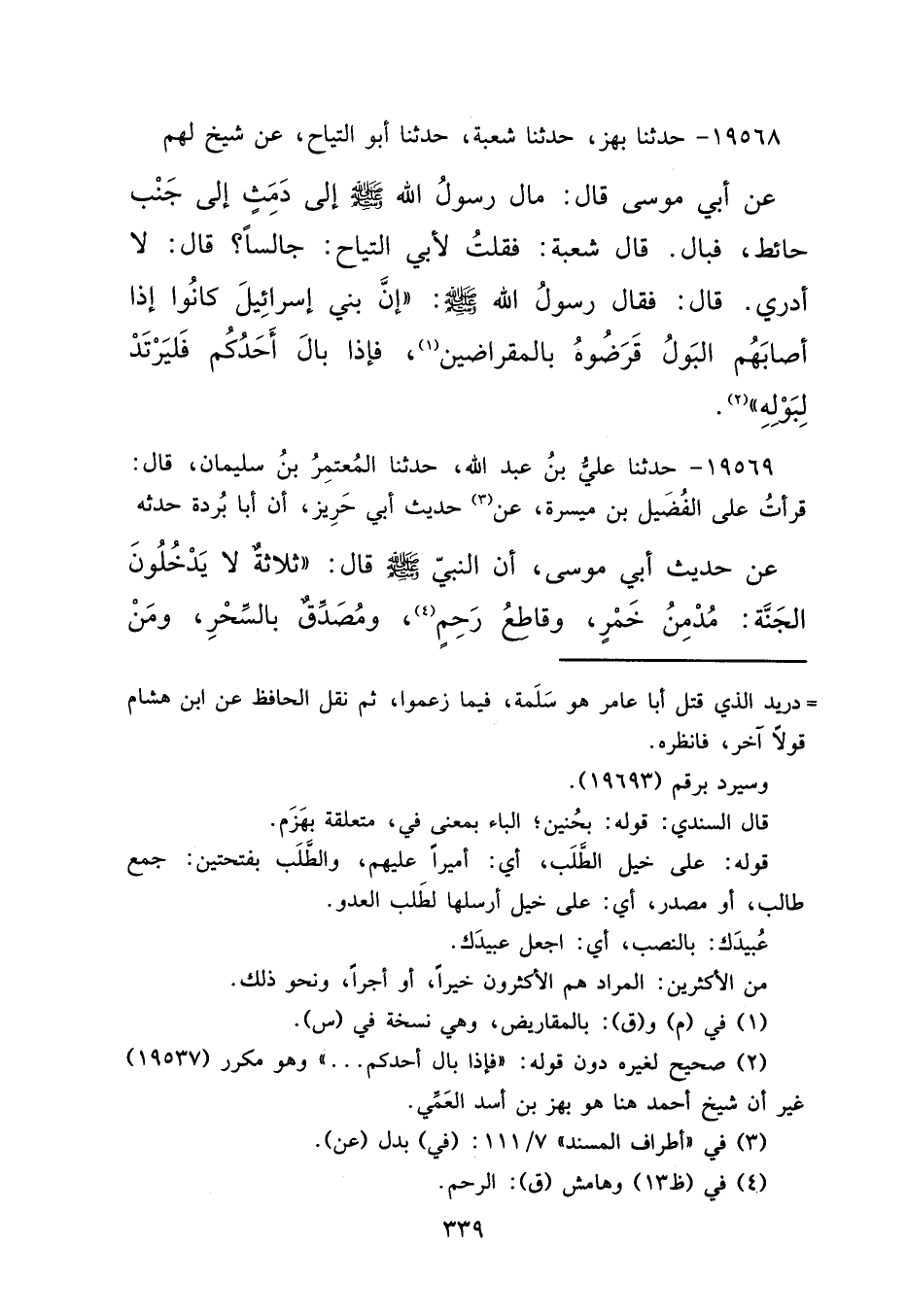 ١٩٥٦٨ - حَدَّثَنَا بَهْزٌ، حَدَّثَنَا شُعْبَةُ، حَدَّثَنَا أَبُو التَّيَّاحِ، عَنْ شَيْخٍ لَهُمْ، عَنْ أَبِي مُوسَى قَالَ مَالَ رَسُولُ اللهِ صَلَّى اللهُ عَلَيْهِ وَسَلَّمَ إِلَى دَمْثٍ إِلَى جَنْبِ حَائِطٍ فَبَالَ. قَالَ شُعْبَةُ فَقُلْتُ لِأَبِى التَّيَّاحِ: جَالِسًا؟ قَالَ: لَا أَدْرِي. قَالَ: فَقَالَ رَسُولُ اللهِ صَلَّى اللهُ عَلَيْهِ وَسَلَّمَ: " إِنَّ بَنِي إِسْرَائِيلَ كَانُوا إِذَا أَصَابَهُمُ الْبَوْلُ قَرَضُوهُ بِالْمَقَراِضينِ (١) ، فَإِذَا بَالَ أَحَدُكُمْ فَلْيَرْتَدْ لِبَوْلِهِ " (٢)