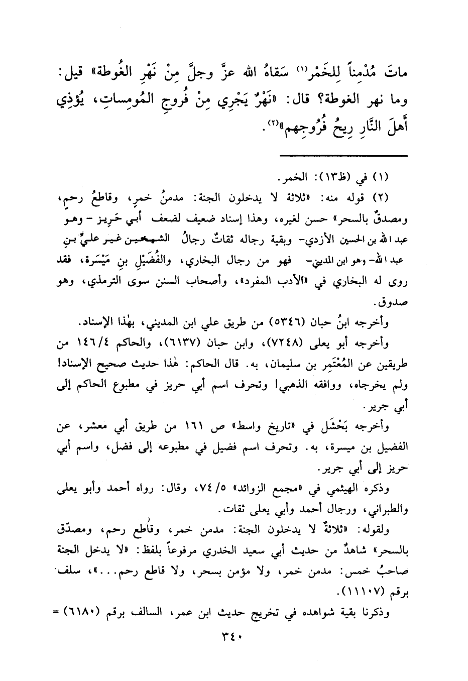 ولقوله: "ثلاثةٌ لا يدخلون الجنة: مدمن خمر، وقاطع رحم، ومصدّق بالسحر" شاهدٌ من حديث أبي سعيد الخدري مرفوعاً بلفظ: "لا يدخل الجنة صاحبُ خمس: مدمن خمر، ولا مؤمن بسحر، ولا قاطع رحم ... "، سلف.