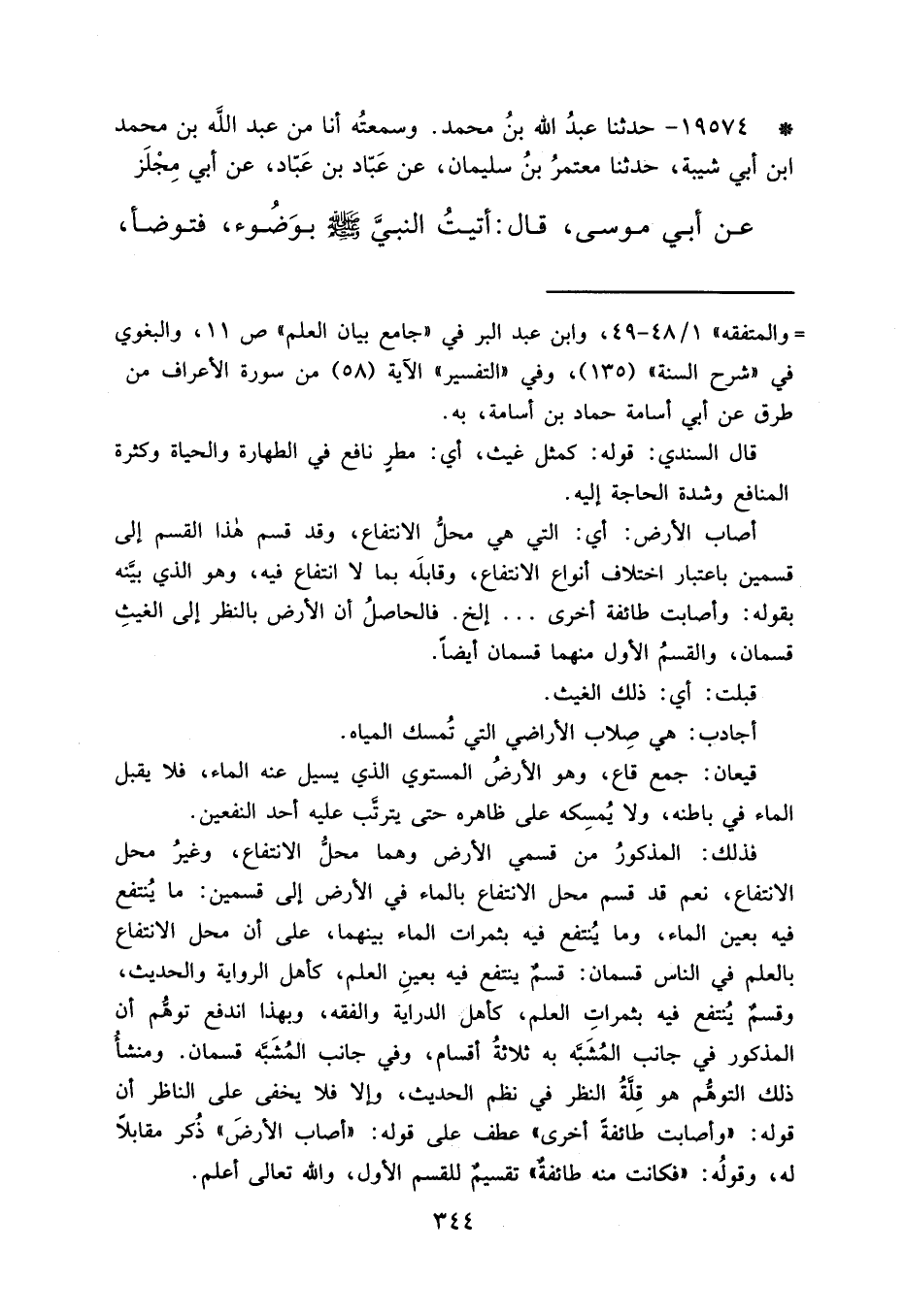 = والمتفقه" ١/٤٨-٤٩، وابن عبد البر في "جامع بيان العلم" ص١١، والبغوي في "شرح السنة" (١٣٥) ، وفي "التفسير" الآية (٥٨) من سورة الأعراف من طرق عن أبي أسامة حماد بن أسامة، به.