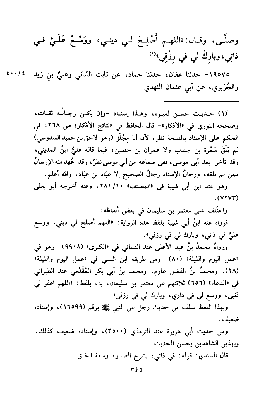 وَصَلَّى وَقَالَ: " اللهُمَّ أَصْلِحْ لِي دِينِي، وَوَسِّعْ عَلَيَّ فِي ذَاتِي، وَبَارِكْ لِي فِي رِزْقِي " (١)