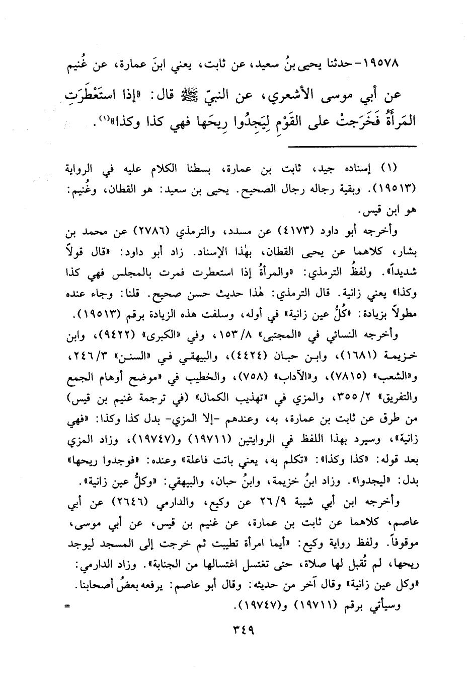 ١٩٥٧٨ - حَدَّثَنَا يَحْيَى بْنُ سَعِيدٍ، عَنْ ثَابِتٍ يَعْنِي ابْنَ عُمَارَةَ، عَنْ غُنَيْمٍ، عَنْ أَبِي مُوسَى الْأَشْعَرِيِّ، عَنِ النَّبِيِّ صَلَّى اللهُ عَلَيْهِ وَسَلَّمَ قَالَ: " إِذَا اسْتَعْطَرَتِ الْمَرْأَةُ فَخَرَجَتْ عَلَى الْقَوْمِ لِيَجِدُوا رِيحَهَا فَهِيَ كَذَا وَكَذَا " (١)