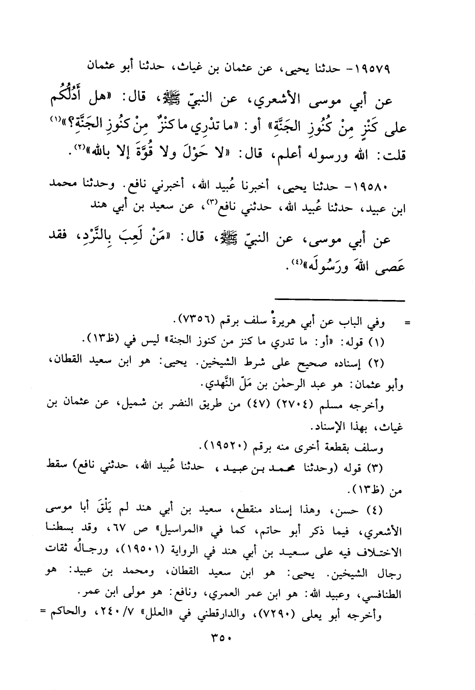 ١٩٥٧٩ - حَدَّثَنَا يَحْيَى، عَنْ عُثْمَانَ بْنِ غِيَاثٍ، حَدَّثَنَا أَبُو عُثْمَانَ، عَنْ أَبِي مُوسَى الْأَشْعَرِيِّ، عَنِ النَّبِيِّ صَلَّى اللهُ عَلَيْهِ وَسَلَّمَ قَالَ: " هَلْ أَدُلُّكُمْ عَلَى كَنْزٍ مِنْ كُنُوزِ الْجَنَّةِ؟ " أَوَ " مَا تَدْرِي مَا كَنْزٌ مِنْ كُنُوزِ الْجَنَّةِ؟ (١) " قُلْتُ: اللهُ وَرَسُولُهُ أَعْلَمُ. قَالَ: " لَا حَوْلَ وَلَا قُوَّةَ إِلَّا بِاللهِ " (٢)
