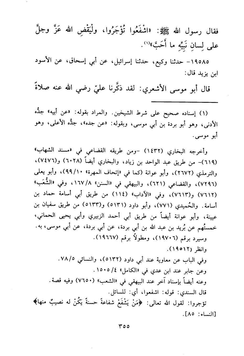 فَقَالَ رَسُولُ اللهِ صَلَّى اللهُ عَلَيْهِ وَسَلَّمَ: " اشْفَعُوا تُؤْجَرُوا، وَلْيَقْضِ اللهُ عَزَّ وَجَلَّ عَلَى لِسَانِ نَبِيِّهِ مَا أَحَبَّ " (١)