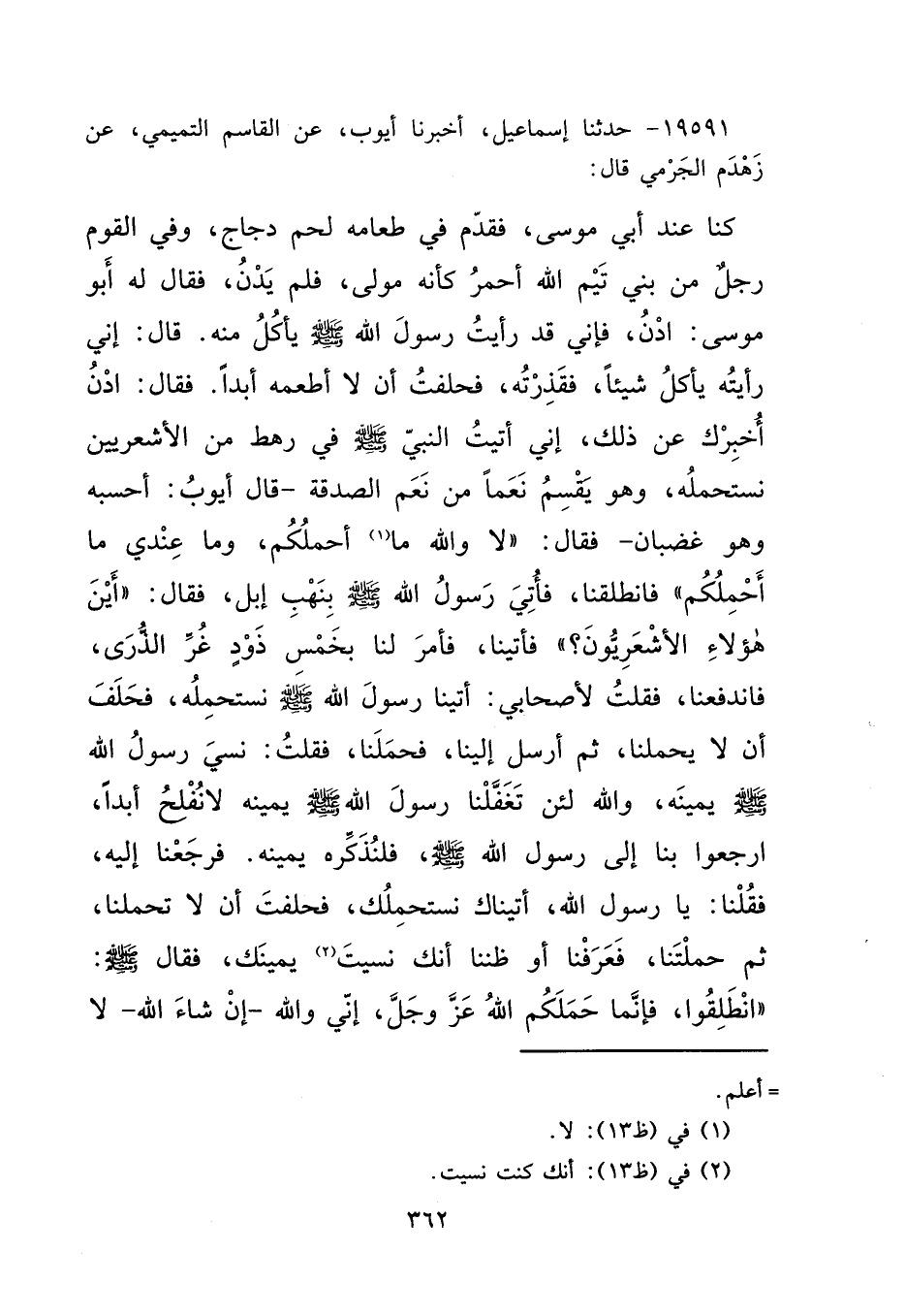 ١٩٥٩١ - حَدَّثَنَا إِسْمَاعِيلُ، أَخْبَرَنَا أَيُّوبُ، عَنِ الْقَاسِمِ التَّمِيمِيِّ، عَنْ زَهْدَمٍ الْجَرْمِيِّ قَالَ: كُنَّا عِنْدَ أَبِي مُوسَى فَقَدَّمَ فِي طَعَامِهِ لَحْمَ دَجَاجٍ، وَفِي الْقَوْمِ رَجُلٌ مِنْ بَنِي تَيْمِ اللهِ أَحْمَرُ كَأَنَّهُ مَوْلًى، فَلَمْ يَدْنُ. قَالَ لَهُ أَبُو مُوسَى: ادْنُ؛ فَإِنِّي قَدْ رَأَيْتُ رَسُولَ اللهِ صَلَّى اللهُ عَلَيْهِ وَسَلَّمَ يَأْكُلُ مِنْهُ. قَالَ: إِنِّي رَأَيْتُهُ يَأْكُلُ شَيْئًا فَقَذِرْتُهُ، فَحَلَفْتُ أَنْ لَا أَطْعَمَهُ أَبَدًا. فَقَالَ: ادْنُ أُخْبِرْكَ عَنْ ذَلِكَ. إِنِّي أَتَيْتُ النَّبِيَّ صَلَّى اللهُ عَلَيْهِ وَسَلَّمَ فِي رَهْطٍ مِنَ الْأَشْعَرِيِّينَ نَسْتَحْمِلُهُ وَهُوَ يَقْسِمُ نَعَمًا مِنْ نَعَمِ الصَّدَقَةِ. قَالَ أَيُّوبُ: أَحْسِبُهُ وَهُوَ غَضْبَانُ. فَقَالَ: " لَا. وَاللهِ مَا (١) أَحْمِلُكُمْ وَمَا عِنْدِي مَا أَحْمِلُكُمْ ". فَانْطَلَقْنَا فَأُتِيَ رَسُولُ اللهِ صَلَّى اللهُ عَلَيْهِ وَسَلَّمَ بِنَهْبِ إِبِلٍ. فَقَالَ: " أَيْنَ هَؤُلَاءِ الْأَشْعَرِيُّونَ؟ " فَأَتَيْنَا فَأَمَرَ لَنَا بِخَمْسِ ذَوْدٍ غُرِّ الذُّرَى فَانْدَفَعْنَا، فَقُلْتُ لِأَصْحَابِي: أَتَيْنَا رَسُولَ اللهِ صَلَّى اللهُ عَلَيْهِ وَسَلَّمَ نَسْتَحْمِلُهُ فَحَلَفَ أَنْ لَا يَحْمِلَنَا، ثُمَّ أَرْسَلَ إِلَيْنَا فَحَمَلَنَا، فَقُلْتُ نَسِيَ رَسُولُ اللهِ صَلَّى اللهُ عَلَيْهِ وَسَلَّمَ يَمِينَهُ، وَاللهِ لَئِنْ تَغَفَّلْنَا رَسُولَ اللهِ صَلَّى اللهُ عَلَيْهِ وَسَلَّمَ يَمِينَهُ لَا نُفْلِحُ أَبَدًا، ارْجِعُوا بِنَا إِلَى رَسُولِ اللهِ صَلَّى اللهُ عَلَيْهِ وَسَلَّمَ فَلْنُذَكِّرْهُ يَمِينَهُ، فَرَجَعْنَا إِلَيْهِ فَقُلْنَا: يَا رَسُولَ اللهِ أَتَيْنَاكَ نَسْتَحْمِلُكَ فَحَلَفْتَ أَنْ لَا تَحْمِلَنَا، ثُمَّ حَمَلْتَنَا، فَعَرَفْنَا أَوْ ظَنَنَّا أَنَّكَ نَسِيتَ (٢) يَمِينَكَ، فَقَالَ صَلَّى اللهُ عَلَيْهِ وَسَلَّمَ: " انْطَلِقُوا فَإِنَّمَا حَمَلَكُمُ اللهُ عَزَّ وَجَلَّ، إِنِّي وَاللهِ إِنْ شَاءَ اللهُ لَا
