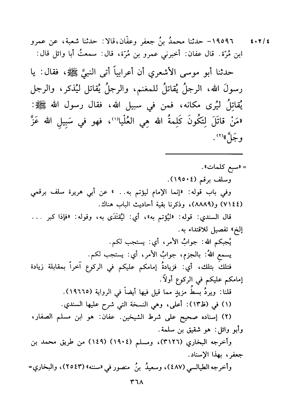 ١٩٥٩٦ - حَدَّثَنَا مُحَمَّدُ بْنُ جَعْفَرٍ، وَعَفَّانُ قَالَا: حَدَّثَنَا شُعْبَةُ، عَنْ عَمْرِو بْنِ مُرَّةَ قَالَ: عَفَّانُ، أَخْبَرَنِي عَمْرُو بْنُ مُرَّةَ قَالَ: سَمِعْتُ أَبَا وَائِلٍ قَالَ: حَدَّثَنَا أَبُو مُوسَى الْأَشْعَرِيُّ، أَنَّ أَعْرَابِيًّا أَتَى النَّبِيَّ صَلَّى اللهُ عَلَيْهِ وَسَلَّمَ فَقَالَ: يَا رَسُولَ اللهِ، الرَّجُلُ يُقَاتِلُ لِلْمَغْنَمِ، وَالرَّجُلُ يُقَاتِلُ لِيُذْكَرَ، وَالرَّجُلُ يُقَاتِلُ لِيُرَى مَكَانُهُ فَمَنْ فِي سَبِيلِ اللهِ؟ فَقَالَ رَسُولُ اللهِ صَلَّى اللهُ عَلَيْهِ وَسَلَّمَ: " مَنْ قَاتَلَ لِتَكُونَ كَلِمَةُ اللهِ هِيَ الْعُلْيَا (١) فَهُوَ فِي سَبِيلِ اللهِ عَزَّ وَجَلَّ " (٢)