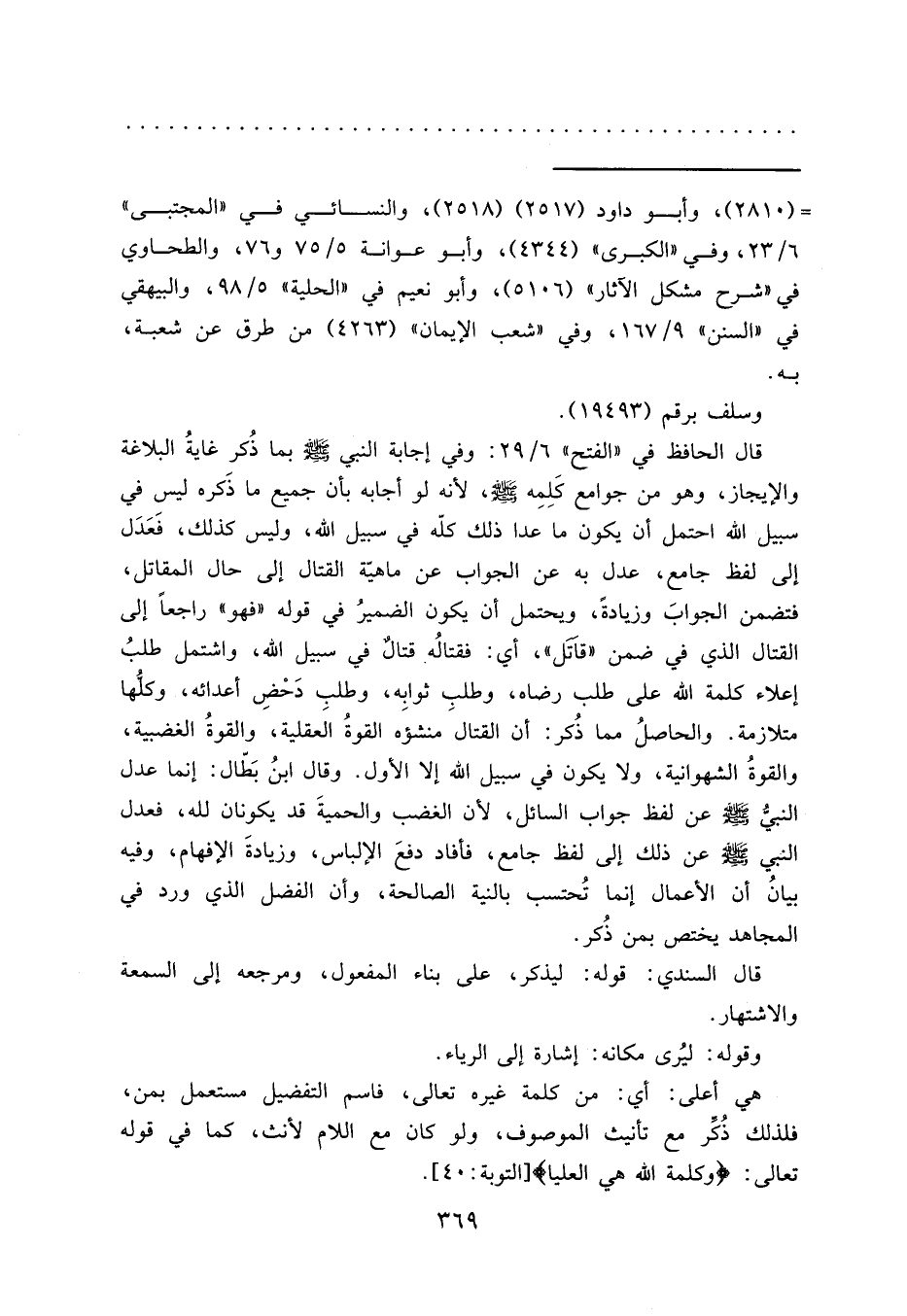 قال الحافظ في "الفتح" ٦/٢٩: وفي إجابة النبي صَلَّى اللهُ عَلَيْهِ وَسَلَّمَ بما ذُكر غايةُ البلاغة والإيجاز، وهو من جوامع كَلِمِه صَلَّى اللهُ عَلَيْهِ وَسَلَّمَ، لأنه لو أجابه بأن جميع ما ذَكره ليس في سبيل الله احتمل أن يكون ما عدا ذلك كلّه في سبيل الله، وليس كذلك، فَعَدَل إلى لفظ جامع، عدل به عن الجواب عن ماهية القتال إلى حال المقاتل، فتضمن الجوابَ وزيادةً، ويحتمل أن يكون الضميرُ في قوله "فهو" راجعاً إلى القتال الذي في ضمن "قاتل"، أي: فقتالُه قتالٌ في سبيل الله، واشتمل طلبُ