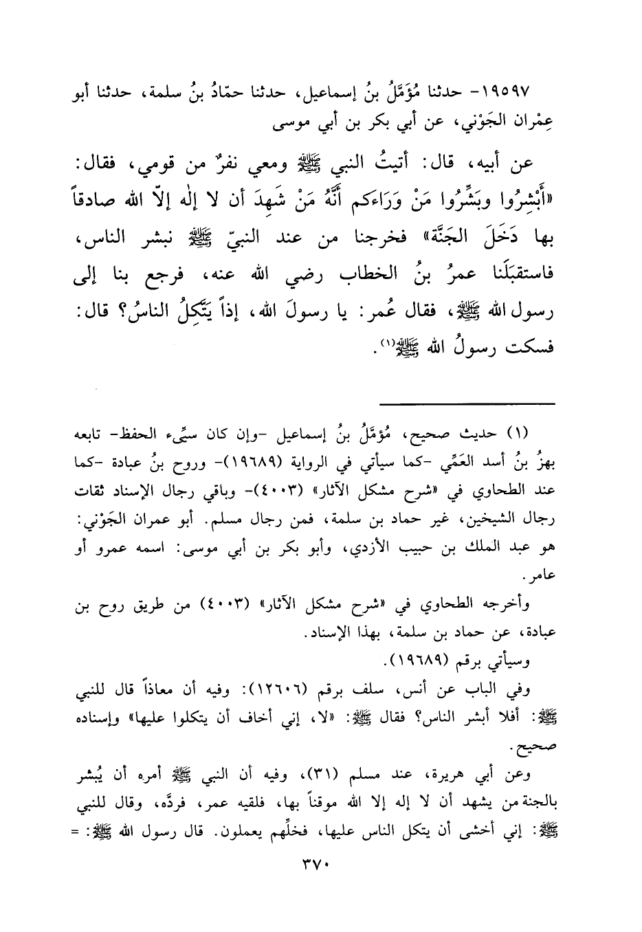١٩٥٩٧ - حَدَّثَنَا مُؤَمَّلُ بْنُ إِسْمَاعِيلَ، حَدَّثَنَا حَمَّادُ بْنُ سَلَمَةَ، حَدَّثَنَا أَبُو عِمْرَانَ الْجَوْنِيُّ، عَنْ أَبِي بَكْرِ بْنِ أَبِي مُوسَى، عَنْ أَبِيهِ قَالَ: أَتَيْتُ النَّبِيَّ صَلَّى اللهُ عَلَيْهِ وَسَلَّمَ وَمَعِي نَفَرٌ مِنْ قَوْمِي فَقَالَ: " أَبْشِرُوا وَبَشِّرُوا مَنْ وَرَاءَكُمْ، أَنَّهُ مَنْ شَهِدَ أَنْ لَا إِلَهَ إِلَّا اللهُ صَادِقًا بِهَا دَخَلَ الْجَنَّةَ " فَخَرَجْنَا مِنْ عِنْدِ النَّبِيِّ صَلَّى اللهُ عَلَيْهِ وَسَلَّمَ نُبَشِّرُ النَّاسَ، فَاسْتَقْبَلَنَا عُمَرُ بْنُ الْخَطَّابِ رَضِيَ اللهُ عَنْهُ فَرَجَعَ بِنَا إِلَى رَسُولِ اللهِ صَلَّى اللهُ عَلَيْهِ وَسَلَّمَ فَقَالَ عُمَرُ: يَا رَسُولَ اللهِ، إِذًا يَتَّكِلَ النَّاسُ؟ قَالَ: فَسَكَتَ رَسُولُ اللهِ صَلَّى اللهُ عَلَيْهِ وَسَلَّمَ (١)