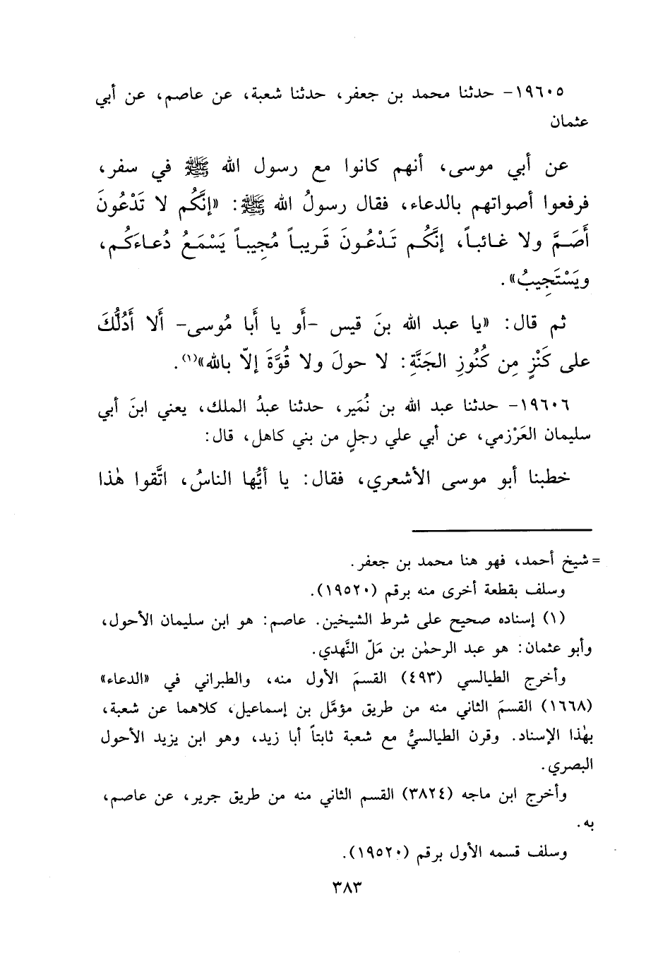 ١٩٦٠٥ - حَدَّثَنَا مُحَمَّدُ بْنُ جَعْفَرٍ، حَدَّثَنَا شُعْبَةُ، عَنْ عَاصِمٍ، عَنْ أَبِي عُثْمَانَ، عَنْ أَبِي مُوسَى أَنَّهُمْ كَانُوا مَعَ رَسُولِ اللهِ صَلَّى اللهُ عَلَيْهِ وَسَلَّمَ فِي سَفَرٍ، فَرَفَعُوا أَصْوَاتَهُمْ بِالدُّعَاءِ فَقَالَ رَسُولُ اللهِ صَلَّى اللهُ عَلَيْهِ وَسَلَّمَ: " إِنَّكُمْ لَا تَدْعُونَ أَصَمَّ وَلَا غَائِبًا. إِنَّكُمْ تَدْعُونَ قَرِيبًا مُجِيبًا يَسْمَعُ دُعَاءَكُمْ وَيَسْتَجِيبُ ". ثُمَّ قَالَ: " يَا عَبْدَ اللهِ بْنَ قَيْسٍ أَوْ يَا أَبَا مُوسَى أَلَا أَدُلُّكَ عَلَى كَنْزٍ مِنْ كُنُوزِ الْجَنَّةِ؟ لَا حَوْلَ وَلَا قُوَّةَ إِلَّا بِاللهِ " (١)