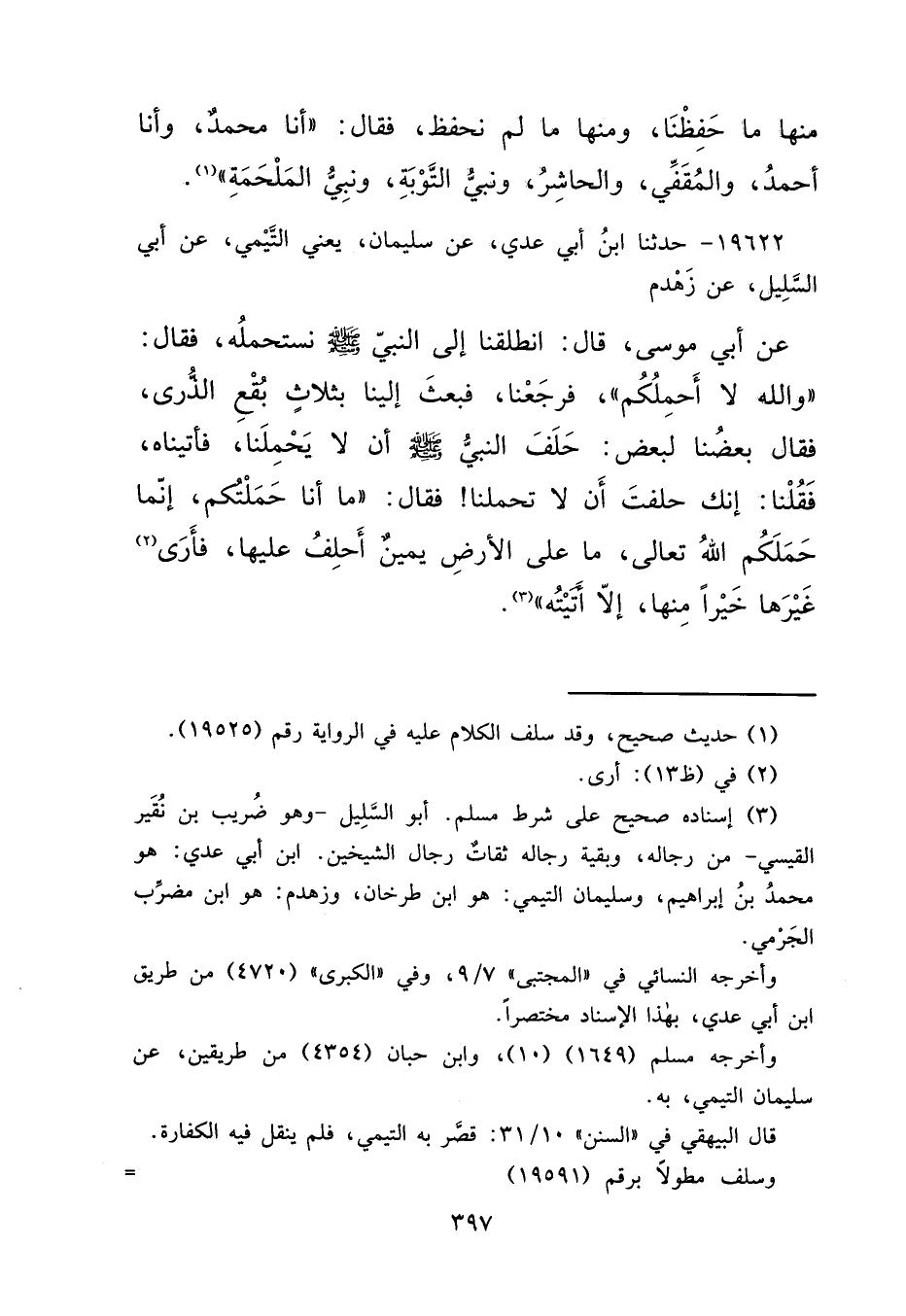 ١٩٦٢٢ - حَدَّثَنَا ابْنُ أَبِي عَدِيٍّ، عَنْ سُلَيْمَانَ يَعْنِي التَّيْمِيَّ، عَنْ أَبِي السَّلِيلِ، عَنْ زَهْدَمٍ، عَنْ أَبِي مُوسَى قَالَ: انْطَلَقْنَا إِلَى النَّبِيِّ صَلَّى اللهُ عَلَيْهِ وَسَلَّمَ نَسْتَحْمِلُهُ فَقَالَ: " وَاللهِ لَا أَحْمِلُكُمْ ". فَرَجَعْنَا فَبَعَثَ إِلَيْنَا بِثَلَاثٍ بُقْعِ الذُّرَى فَقَالَ بَعْضُنَا لِبَعْضٍ حَلَفَ النَّبِيُّ صَلَّى اللهُ عَلَيْهِ وَسَلَّمَ أَنْ لَا يَحْمِلَنَا فَأَتَيْنَاهُ فَقُلْنَا: إِنَّكَ حَلَفْتَ أَنْ لَا تَحْمِلَنَا. فَقَالَ: " مَا أَنَا حَمَلْتُكُمْ إِنَّمَا حَمَلَكُمُ اللهُ تَعَالَى مَا عَلَى الْأَرْضِ يَمِينٌ أَحْلِفُ عَلَيْهَا فَأَرَى (٢) غَيْرَهَا خَيْرًا مِنْهَا إِلَّا أَتَيْتُهُ " (٣)
