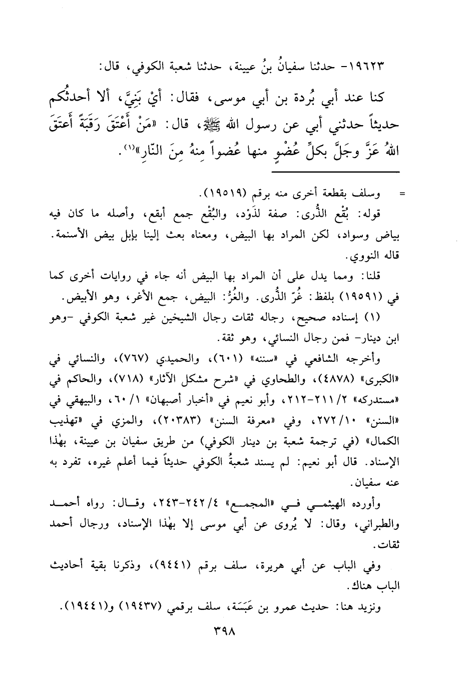 ١٩٦٢٣ - حَدَّثَنَا سُفْيَانُ بْنُ عُيَيْنَةَ، حَدَّثَنَا شُعْبَةُ الْكُوفِيُّ قَالَ: كُنَّا عِنْدَ أَبِي بُرْدَةَ بْنِ أَبِي مُوسَى فَقَالَ: أَيْ بَنِيَّ أَلَا أُحَدِّثُكُمْ حَدِيثًا حَدَّثَنِي أَبِي، عَنْ رَسُولِ اللهِ صَلَّى اللهُ عَلَيْهِ وَسَلَّمَ قَالَ: " مَنْ أَعْتَقَ رَقَبَةً أَعْتَقَ اللهُ عَزَّ وَجَلَّ بِكُلِّ عُضْوٍ مِنْهَا عُضْوًا مِنْهُ مِنَ النَّارِ " (١)