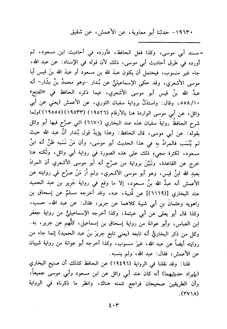 قلنا: وقد نقلنا في الرواية (١٩٤٩٦) عن الحافظ كذلك أن صنيع البخاري "بإيراد حديثيهما" أنه كان عند أبي وائل عن ابن مسعود وأبي موسى جميعاً، وأن الطريقين صحيحان فراجع تتمته هناك، وانظر ما ذكرناه في الرواية (٣٧١٨) .