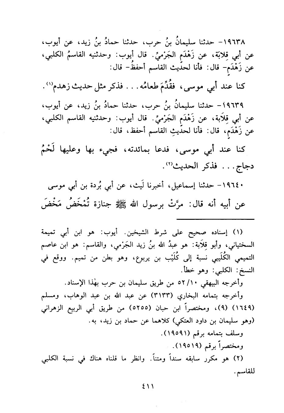 ١٩٦٣٩ - حَدَّثَنَا سُلَيْمَانُ بْنُ حَرْبٍ، حَدَّثَنَا حَمَّادُ بْنُ زَيْدٍ، عَنْ أَيُّوبَ، عَنْ أَبِي قِلَابَةَ، عَنْ زَهْدَمٍ الْجَرْمِيِّ. قَالَ أَيُّوبُ: وَحَدَّثَنِيهِ الْقَاسِمُ الْكَلْبِيُّ، عَنْ زَهْدَمٍ قَالَ: فَأَنَا لِحَدِيثِ الْقَاسِمِ أَحْفَظُ قَالَ: " كُنَّا عِنْدَ أَبِي مُوسَى فَدَعَا بِمَائِدَتِهِ، فَجِيءَ بِهَا وَعَلَيْهَا لَحْمُ دَجَاجٍ فَذَكَرَ الْحَدِيثَ " (٢)