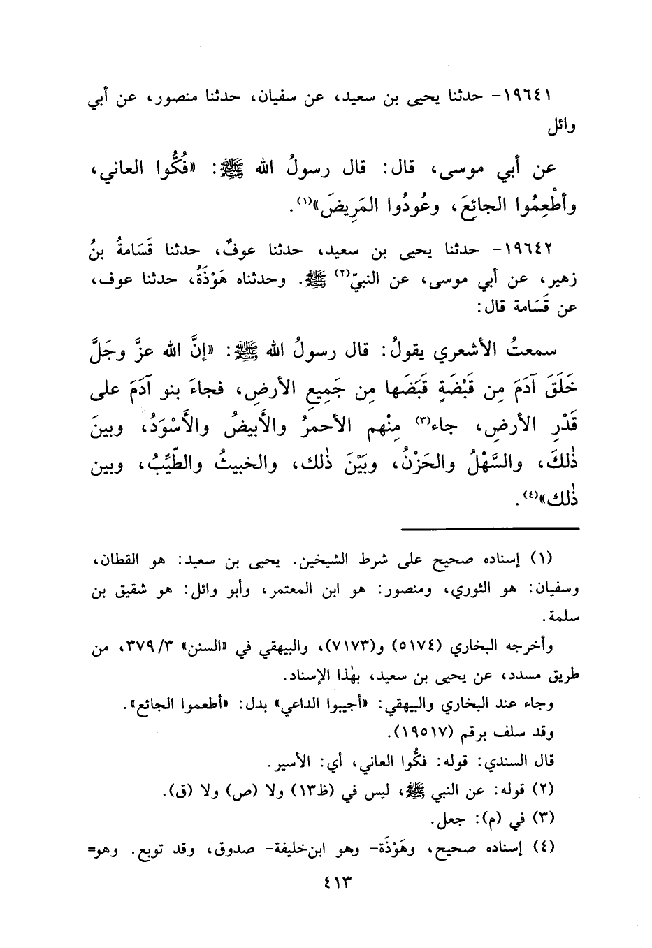 ١٩٦٤١ - حَدَّثَنَا يَحْيَى بْنُ سَعِيدٍ، عَنْ سُفْيَانَ، حَدَّثَنَا مَنْصُورٌ، عَنْ أَبِي وَائِلٍ، عَنْ أَبِي مُوسَى قَالَ: قَالَ رَسُولُ اللهِ صَلَّى اللهُ عَلَيْهِ وَسَلَّمَ: " فُكُّوا الْعَانِيَ، وَأَطْعِمُوا الْجَائِعَ، وَعُودُوا الْمَرِيضَ " (١)