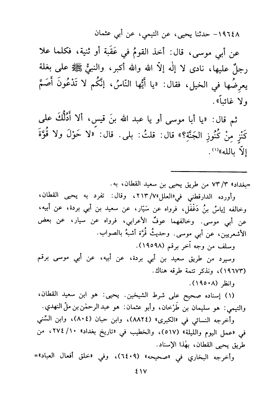 ١٩٦٤٨ - حَدَّثَنَا يَحْيَى، عَنْ التَّيْمِيِّ، عَنْ أَبِي عُثْمَانَ، عَنْ أَبِي مُوسَى قَالَ: أَخَذَ الْقَوْمُ فِي عُقْبَةٍ أَوْ ثَنِيَّةٍ فَكُلَّمَا عَلَا رَجُلٌ عَلَيْهَا نَادَى: لَا إِلَهَ إِلَّا اللهُ وَاللهُ أَكْبَرُ وَالنَّبِيُّ صَلَّى اللهُ عَلَيْهِ وَسَلَّمَ عَلَى بَغْلَةٍ يَعْرِضُهَا فِي الْخَيْلِ. فَقَالَ: " يَا أَيُّهَا النَّاسُ إِنَّكُمْ لَا تَدْعُونَ أَصَمَّ وَلَا غَائِبًا ". ثُمَّ قَالَ: " يَا أَبَا مُوسَى أَوْ يَا عَبْدَ اللهِ بْنَ قَيْسٍ، أَلَا أَدُلُّكَ عَلَى كَنْزٍ مِنْ كُنُوزِ الْجَنَّةِ ". قَالَ: قُلْتُ: بَلَى. قَالَ: " لَا حَوْلَ وَلَا قُوَّةَ إِلَّا بِاللهِ " (١)