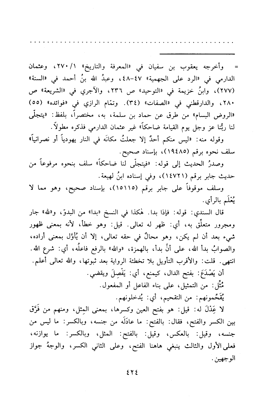 "الروض البسام" من طرق عن حماد بن سلمة، به، مختصراً، بلفظ: "يتجلّى لنا ربُّنا عز وجل يوم القيامة ضاحكاً" غير عثمان الدارمي فذكره مطولاً.