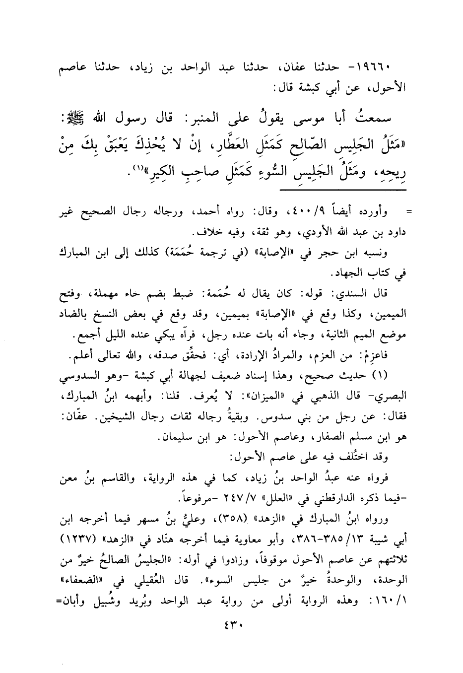 ورواه ابنُ المبارك في "الزهد" (٣٥٨) ، وعليُّ بنُ مسهر فيما أخرجه ابن أبي شيبة ١٣/٣٨٥-٣٨٦، وأبو معاوية فيما أخرجه هنّاد في "الزهد" (١٢٣٧) ثلاثتهم عن عاصم الأحول موقوفاً، وزادوا في أوله: "الجليسُ الصالحُ خير من الوحدة، والوحدةُ خيرٌ من جليس السوء". قال العُقيلي في "الضعفاء" ١/١٦٠: وهذه الرواية أولى من رواية عبد الواحد وبُريد وشُبيل وأبان=
