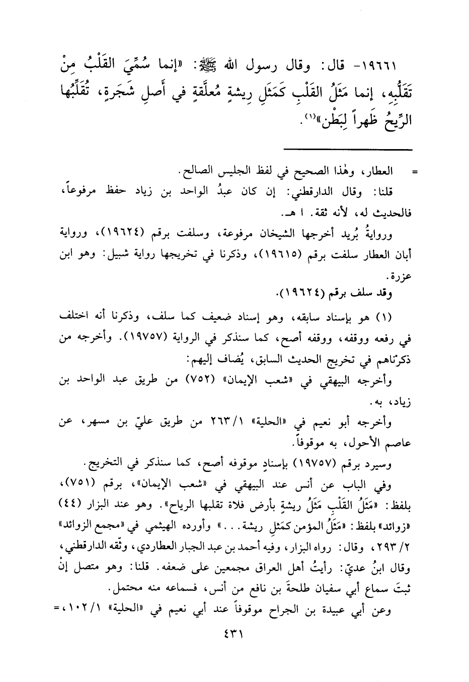 ١٩٦٦١ - قَالَ: وَقَالَ رَسُولُ اللهِ صَلَّى اللهُ عَلَيْهِ وَسَلَّمَ: " إِنَّمَا سُمِّيَ الْقَلْبُ مِنْ تَقَلُّبِهِ، إِنَّمَا مَثَلُ الْقَلْبِ كَمَثَلِ رِيشَةٍ مُعَلَّقَةٍ فِي أَصْلِ شَجَرَةٍ تُقَلِّبُهَا الرِّيحُ ظَهْرًا لِبَطْنٍ " (١)