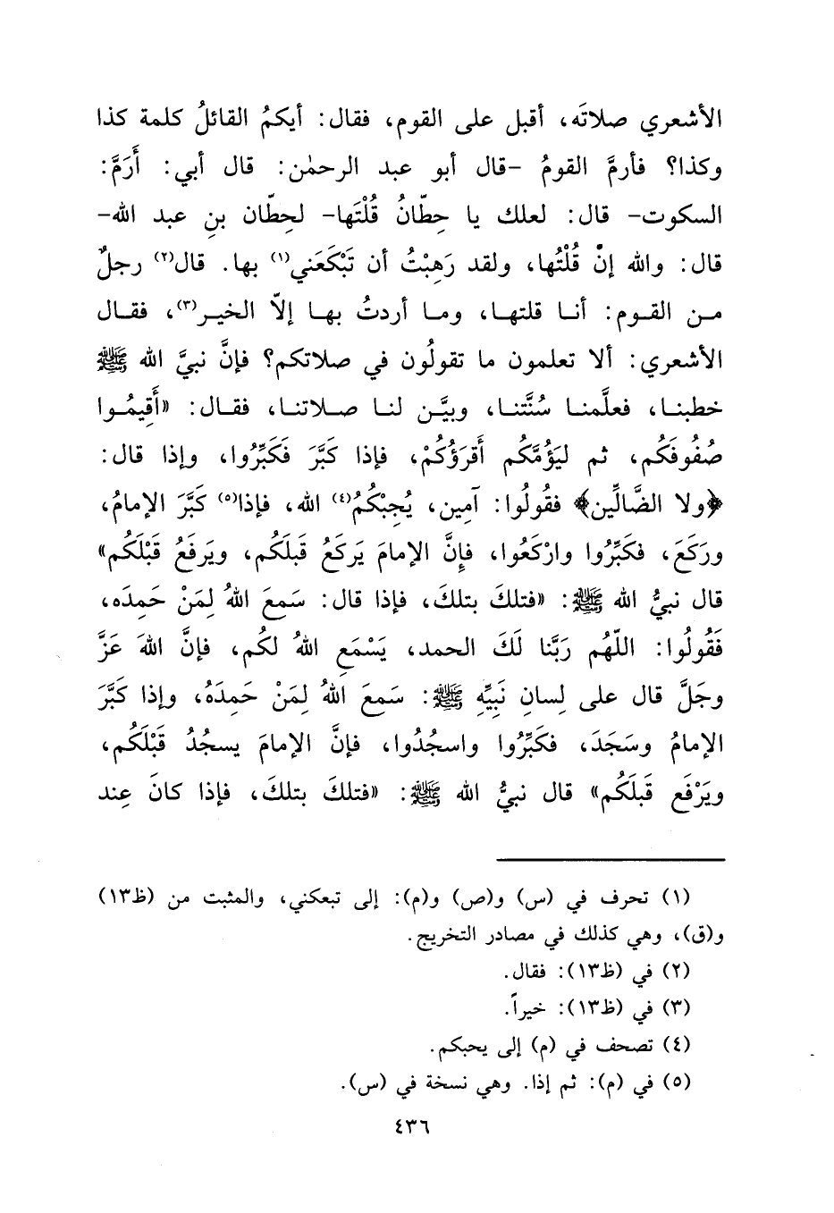 الْأَشْعَرِيُّ صَلَاتَهُ أَقْبَلَ عَلَى الْقَوْمِ فَقَالَ: أَيُّكُمُ الْقَائِلُ كَلِمَةَ كَذَا وَكَذَا؟ فَأَرَمَّ الْقَوْمُ، قَالَ: أَبُو عَبْدِ الرَّحْمَنِ قَالَ أَبِي: أَرَمَّ: السُّكُوتُ، قَالَ: لَعَلَّكَ يَا حِطَّانُ قُلْتَهَا لِحِطَّانَ بْنِ عَبْدِ اللهِ قَالَ: وَاللهِ إِنْ قُلْتُهَا، وَلَقَدْ رَهِبْتُ أَنْ تَبْكَعَنِي (١) بِهَا. قَالَ (٢) رَجُلٌ مِنَ الْقَوْمِ: أَنَا قُلْتُهَا وَمَا أَرَدْتُ بِهَا إِلَّا الْخَيْرَ (٣) . فَقَالَ الْأَشْعَرِيُّ: أَلَا تَعْلَمُونَ مَا تَقُولُونَ فِي صَلَاتِكُمْ؟ فَإِنَّ نَبِيَّ اللهِ صَلَّى اللهُ عَلَيْهِ وَسَلَّمَ خَطَبَنَا فَعَلَّمَنَا سُنَّتَنَا، وَبَيَّنَ لَنَا صَلَاتَنَا فَقَالَ: " أَقِيمُوا صُفُوفَكُمْ، ثُمَّ لِيَؤُمَّكُمْ أَقْرَؤُكُمْ، فَإِذَا كَبَّرَ فَكَبِّرُوا، وَإِذَا قَالَ: {وَلَا الضَّالِّينَ} [الفاتحة: ٧] فَقُولُوا: آمِينَ. يُجِبْكُمُ (٤) اللهُ، فإِذَا (٥) كَبَّرَ الْإِمَامُ وَرَكَعَ فَكَبِّرُوا، وَارْكَعُوا؛ فَإِنَّ الْإِمَامَ يَرْكَعُ قَبْلَكُمْ، وَيَرْفَعُ قَبْلَكُمْ ". قَالَ نَبِيُّ اللهِ صَلَّى اللهُ عَلَيْهِ وَسَلَّمَ: " فَتِلْكَ بِتِلْكَ ". فَإِذَا قَالَ: " سَمِعَ اللهُ لِمَنْ حَمِدَهُ. فَقُولُوا: اللهُمَّ رَبَّنَا لَكَ الْحَمْدُ، يَسْمَعِ اللهُ لَكُمْ، فَإِنَّ اللهَ عَزَّ وَجَلَّ قَالَ عَلَى لِسَانِ نَبِيِّهِ صَلَّى اللهُ عَلَيْهِ وَسَلَّمَ: سَمِعَ اللهُ لِمَنْ حَمِدَهُ، وَإِذَا كَبَّرَ الْإِمَامُ وَسَجَدَ فَكَبِّرُوا، وَاسْجُدُوا؛ فَإِنَّ الْإِمَامَ يَسْجُدُ قَبْلَكُمْ وَيَرْفَعُ قَبْلَكُمْ ". قَالَ نَبِيُّ اللهِ صَلَّى اللهُ عَلَيْهِ وَسَلَّمَ: " فَتِلْكَ بِتِلْكَ ". فَإِذَا كَانَ عِنْدَ