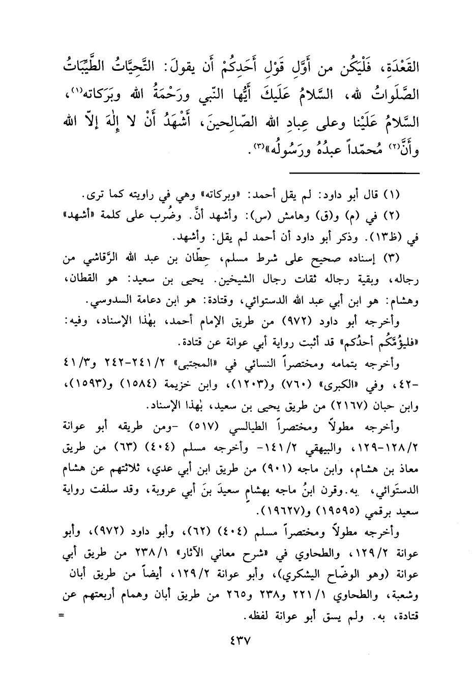 الْقَعْدَةِ، فَلْيَكُنْ مِنْ أَوَّلِ قَوْلِ أَحَدِكُمْ أَنْ يَقُولَ: " التَّحِيَّاتُ الطَّيِّبَاتُ، الصَّلَوَاتُ لِلَّهِ. السَّلَامُ عَلَيْكَ أَيُّهَا النَّبِيُّ وَرَحْمَةُ اللهِ وَبَرَكَاتُهُ، (١) السَّلَامُ عَلَيْنَا، وَعَلَى عِبَادِ اللهِ الصَّالِحِينَ. أَشْهَدُ أَنْ لَا إِلَهَ إِلَّا اللهُ، وَأَنَّ (٢) مُحَمَّدًا عَبْدُهُ وَرَسُولُهُ " (٣)