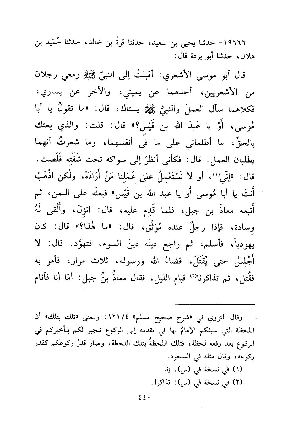 ١٩٦٦٦ - حَدَّثَنَا يَحْيَى بْنُ سَعِيدٍ، حَدَّثَنَا قُرَّةُ بْنُ خَالِدٍ، حَدَّثَنَا حُمَيْدُ بْنُ هِلَالٍ، حَدَّثَنَا أَبُو بُرْدَةَ قَالَ: قَالَ أَبُو مُوسَى الْأَشْعَرِيُّ: أَقْبَلْتُ إِلَى النَّبِيِّ صَلَّى اللهُ عَلَيْهِ وَسَلَّمَ وَمَعِي رَجُلَانِ مِنَ الْأَشْعَرِيِّينَ: أَحَدُهُمَا عَنْ يَمِينِي، وَالْآخَرُ عَنْ يَسَارِي فَكِلَاهُمَا سَأَلَ الْعَمَلَ وَالنَّبِيُّ صَلَّى اللهُ عَلَيْهِ وَسَلَّمَ يَسْتَاكُ قَالَ: " مَا تَقُولُ يَا أَبَا مُوسَى أَوْ يَا عَبْدَ اللهِ بْنَ قَيْسٍ؟ " قَالَ: قُلْتُ: وَالَّذِي بَعَثَكَ بِالْحَقِّ مَا أَطْلَعَانِي عَلَى مَا فِي أَنْفُسِهِمَا، وَمَا شَعُرْتُ أَنَّهُمَا يَطْلُبَانِ الْعَمَلَ. قَالَ: فَكَأَنِّي أَنْظُرُ إِلَى سِوَاكِهِ تَحْتَ شَفَتِهِ قَلَصَتْ. قَالَ: " إِنِّي (١) أَوْ لَا نَسْتَعْمِلُ عَلَى عَمَلِنَا مَنْ أَرَادَهُ، وَلَكِنْ اذْهَبْ أَنْتَ يَا أَبَا مُوسَى أَوْ يَا عَبْدَ اللهِ بْنَ قَيْسٍ ". فَبَعَثَهُ عَلَى الْيَمَنِ، ثُمَّ أَتْبَعَهُ مُعَاذَ بْنَ جَبَلٍ، فَلَمَّا قَدِمَ عَلَيْهِ قَالَ: انْزِلْ وَأَلْقَى لَهُ وِسَادَةً، فَإِذَا رَجُلٌ عِنْدَهُ مُوثَقٌ قَالَ: " مَا هَذَا؟ " قَالَ: كَانَ يَهُودِيًّا فَأَسْلَمَ، ثُمَّ رَاجَعَ دِينَهُ دِينَ السَّوْءِ فَتَهَوَّدَ. قَالَ: لَا أَجْلِسُ حَتَّى يُقْتَلَ قَضَاءُ اللهِ وَرَسُولِهِ ثَلَاثَ مِرَارٍ، فَأَمَرَ بِهِ فَقُتِلَ، ثُمَّ تَذَاكَرْنَا (٢) قِيَامَ اللَّيْلِ، فَقَالَ مُعَاذُ بْنُ جَبَلٍ: " أَمَّا أَنَا فَأَنَامُ،