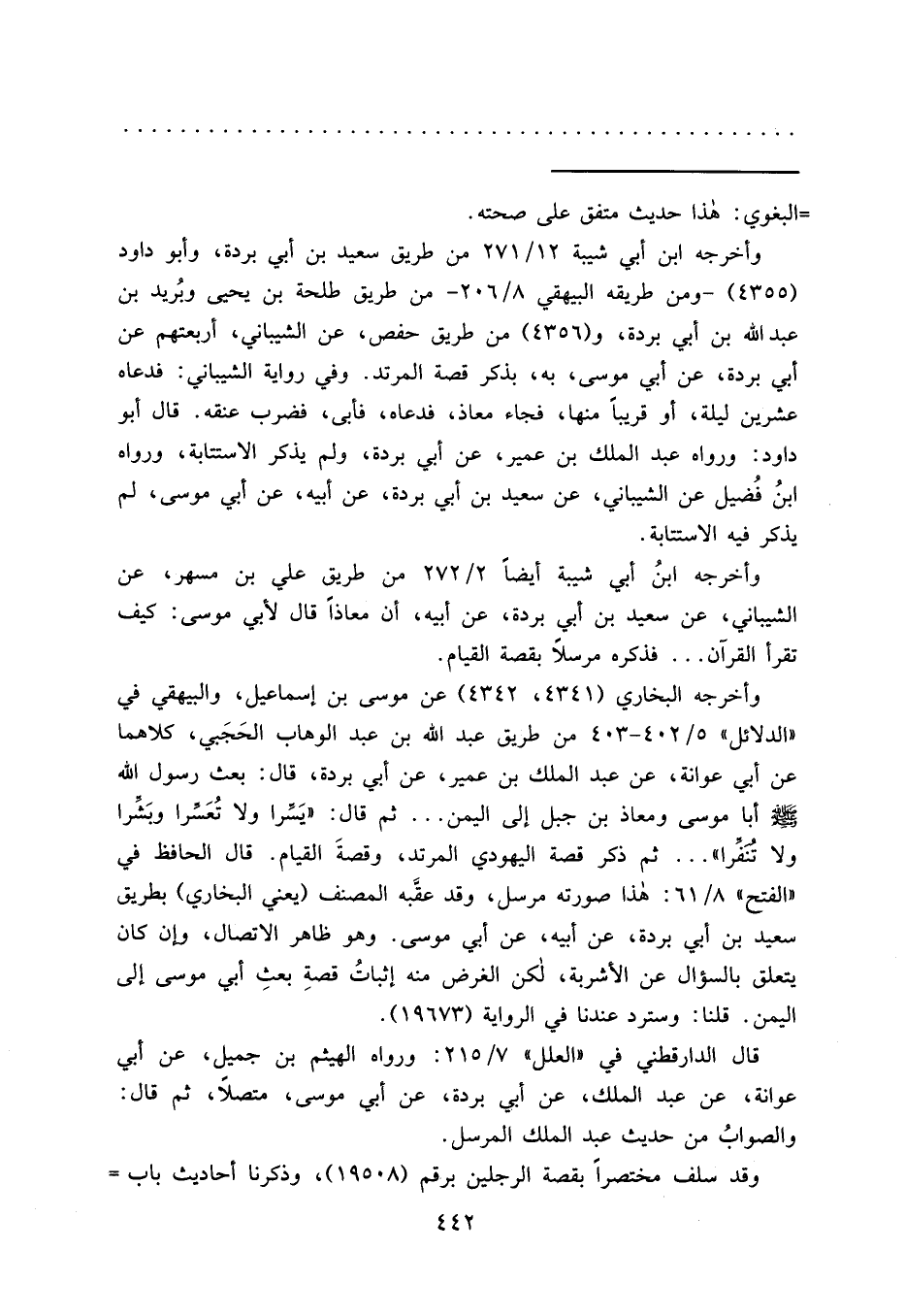 وأخرجه البخاري (٤٣٤١، ٤٣٤٢) عن موسى بن إسماعيل، والبيهقي في "الدلائل" ٥/٤٠٢-٤٠٣ من طريق عبد الله بن عبد الوهاب الحَجَبي، كلاهما عن أبي عوانة، عن عبد الملك بن عمير، عن أبي بردة، قال: بعث رسول الله صَلَّى اللهُ عَلَيْهِ وَسَلَّمَ أبا موسى ومعاذ بن جبل إلى اليمن ... ثم قال: "يَسِّرا ولا تُعَسِّرا وبَشرا ولا تنفرا" ... ثم ذكر قصة اليهودي المرتد، وقصةَ القيام. قال الحافظ في