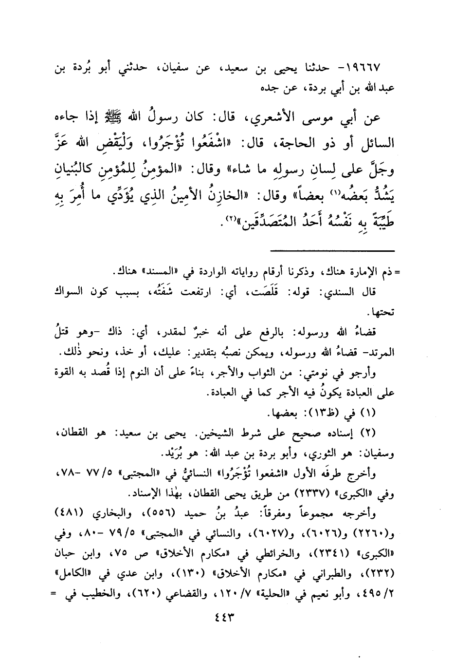 ١٩٦٦٧ - حَدَّثَنَا يَحْيَى بْنُ سَعِيدٍ، عَنْ سُفْيَانَ، حَدَّثَنِي أَبُو بُرْدَةَ بْنُ عَبْدِ اللهِ بْنِ أَبِي بُرْدَةَ، عَنْ جَدِّهِ، عَنْ أَبِي مُوسَى الْأَشْعَرِيِّ قَالَ: كَانَ رَسُولُ اللهِ صَلَّى اللهُ عَلَيْهِ وَسَلَّمَ إِذَا جَاءَهُ السَّائِلُ أَوْ ذُو الْحَاجَةِ قَالَ: " اشْفَعُوا تُؤْجَرُوا، وَلْيَقْضِ اللهُ عَزَّ وَجَلَّ عَلَى لِسَانِ رَسُولِهِ مَا شَاءَ ". وَقَالَ: " الْمُؤْمِنُ لِلْمُؤْمِنِ كَالْبُنْيَانِ يَشُدُّ بَعْضُهُ (١) بَعْضًا ". وَقَالَ: " الْخَازِنُ الْأَمِينُ الَّذِي يُؤَدِّي مَا أُمِرَ بِهِ طَيِّبَةً بِهِ نَفْسُهُ أَحَدُ الْمُتَصَدِّقِينَ " (٢)
