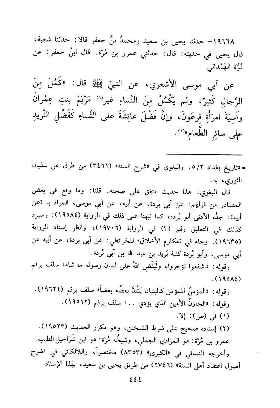 ١٩٦٦٨ - حَدَّثَنَا يَحْيَى بْنُ سَعِيدٍ، وَمُحَمَّدُ بْنُ جَعْفَرٍ قَالَا: حَدَّثَنَا شُعْبَةُ قَالَ يَحْيَى فِي حَدِيثِهِ قَالَ: حَدَّثَنِي عَمْرُو بْنُ مُرَّةَ قَالَ ابْنُ جَعْفَرٍ: عَنْ مُرَّةَ الْهَمْدَانِيِّ، عَنْ أَبِي مُوسَى الْأَشْعَرِيِّ، عَنِ النَّبِيِّ صَلَّى اللهُ عَلَيْهِ وَسَلَّمَ قَالَ: " كَمُلَ مِنَ الرِّجَالِ كَثِيرٌ، وَلَمْ يَكْمُلْ مِنَ النِّسَاءِ غَيْرُ (١) مَرْيَمَ بِنْتِ عِمْرَانَ، وَآسِيَةَ امْرَأَةِ فِرْعَوْنَ، وَإِنَّ فَضْلَ عَائِشَةَ عَلَى النِّسَاءِ كَفَضْلِ الثَّرِيدِ عَلَى سَائِرِ الطَّعَامِ " (٢)