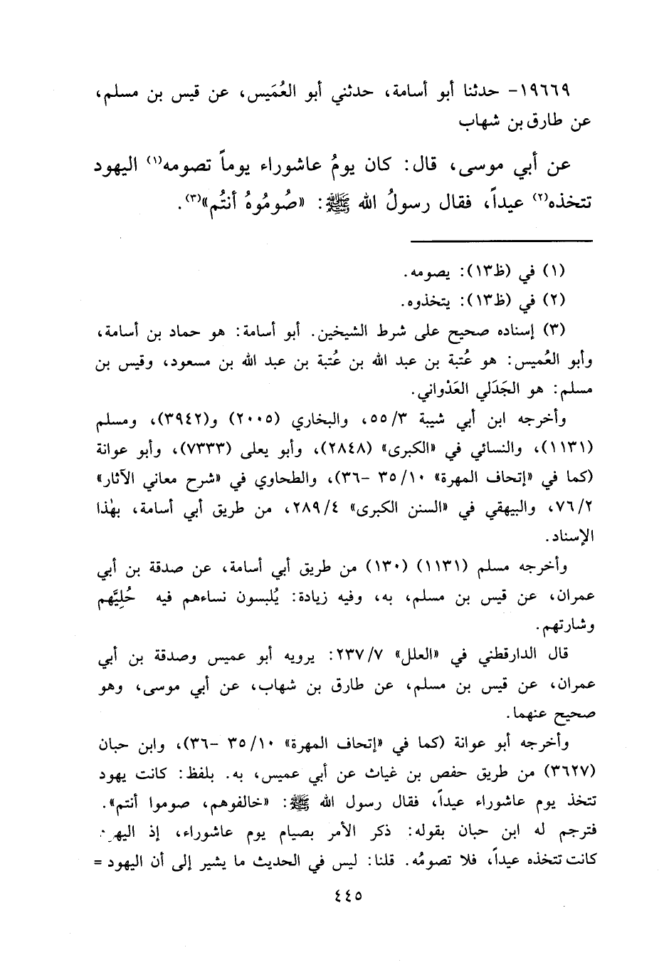 ١٩٦٦٩ - حَدَّثَنَا أَبُو أُسَامَةَ، حَدَّثَنِي أَبُو الْعُمَيْسِ، عَنْ قَيْسِ بْنِ مُسْلِمٍ، عَنْ طَارِقِ بْنِ شِهَابٍ، عَنْ أَبِي مُوسَى قَالَ: كَانَ يَوْمُ عَاشُورَاءَ يَوْمًا تَصُومُهُ (١) الْيَهُودُ تَتَّخِذُهُ (٢) عِيدًا. فَقَالَ رَسُولُ اللهِ صَلَّى اللهُ عَلَيْهِ وَسَلَّمَ: " صُومُوهُ أَنْتُمْ " (٣)