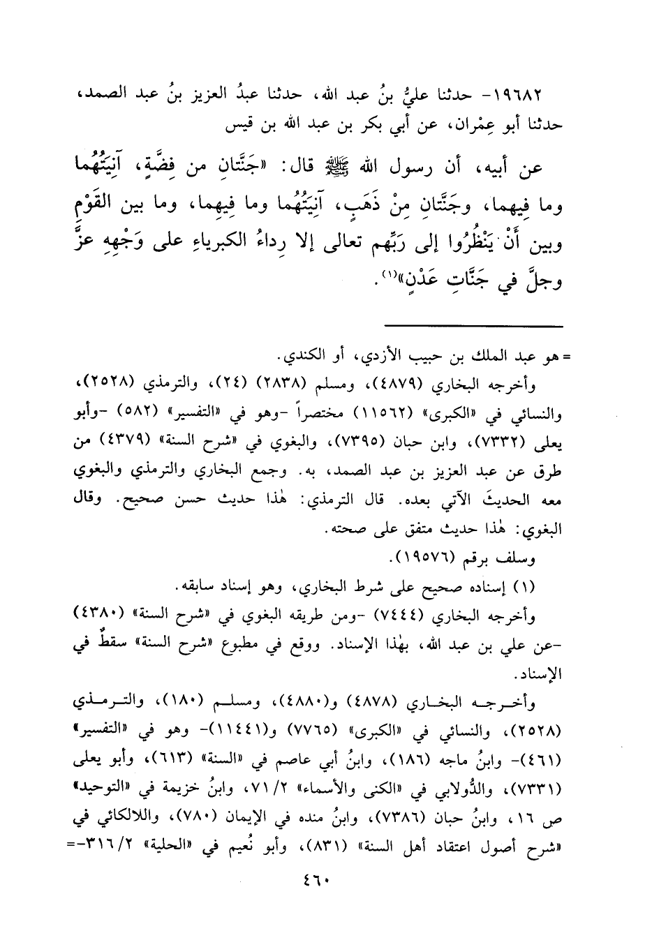 ١٩٦٨٢ - حَدَّثَنَا عَلِيُّ بْنُ عَبْدِ اللهِ، حَدَّثَنَا عَبْدُ الْعَزِيزِ بْنُ عَبْدِ الصَّمَدِ، حَدَّثَنَا أَبُو عِمْرَانَ، عَنْ أَبِي بَكْرِ بْنِ عَبْدِ اللهِ بْنِ قَيْسٍ، عَنْ أَبِيهِ، أَنَّ رَسُولَ اللهِ صَلَّى اللهُ عَلَيْهِ وَسَلَّمَ قَالَ: " جَنَّتَانِ مِنْ فِضَّةٍ آنِيَتُهُمَا وَمَا فِيهِمَا، وَجَنَّتَانِ مِنْ ذَهَبٍ آنِيَتُهُمَا، وَمَا فِيهِمَا، وَمَا بَيْنَ الْقَوْمِ وَبَيْنَ أَنْ يَنْظُرُوا إِلَى رَبِّهِمْ تَعَالَى إِلَّا رِدَاءُ الْكِبْرِيَاءِ عَلَى وَجْهِهِ عَزَّ وَجَلَّ فِي جَنَّاتِ عَدْنٍ " (١)