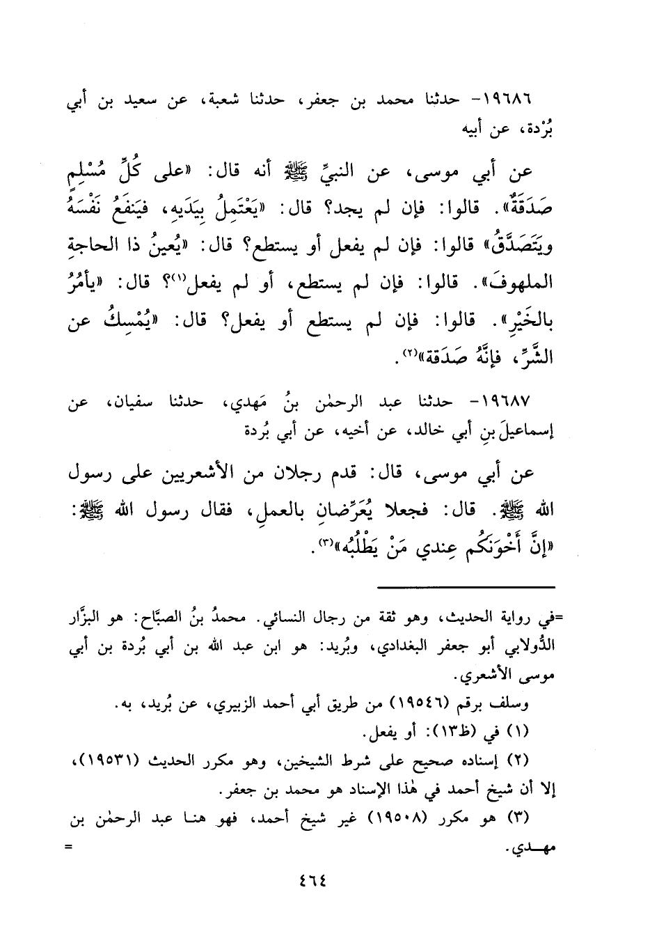 ١٩٦٨٦ - حَدَّثَنَا مُحَمَّدُ بْنُ جَعْفَرٍ، حَدَّثَنَا شُعْبَةُ، عَنْ سَعِيدِ بْنِ أَبِي بُرْدَةَ، عَنْ أَبِيهِ، عَنْ أَبِي مُوسَى، عَنِ النَّبِيِّ صَلَّى اللهُ عَلَيْهِ وَسَلَّمَ أَنَّهُ قَالَ: " عَلَى كُلِّ مُسْلِمٍ صَدَقَةٌ ". قَالُوا: فَإِنْ لَمْ يَجِدْ. قَالَ: " يَعْتَمِلُ بِيَدَيْهِ فَيَنْفَعُ نَفْسَهُ وَيَتَصَدَّقُ ". قَالُوا: فَإِنْ لَمْ يَفْعَلْ أَوْ يَسْتَطِعْ. قَالَ: " يُعِينُ ذَا الْحَاجَةِ الْمَلْهُوفَ ". قَالُوا: فَإِنْ لَمْ يَسْتَطِعْ أَوْ لَمْ يَفْعَلْ (١) . قَالَ: " يَأْمُرُ بِالْخَيْرِ ". قَالُوا: فَإِنْ لَمْ يَسْتَطِعْ أَوْ يَفْعَلْ. قَالَ: " يُمْسِكُ عَنِ الشَّرِّ؛ فَإِنَّهُ صَدَقَةٌ " (٢)