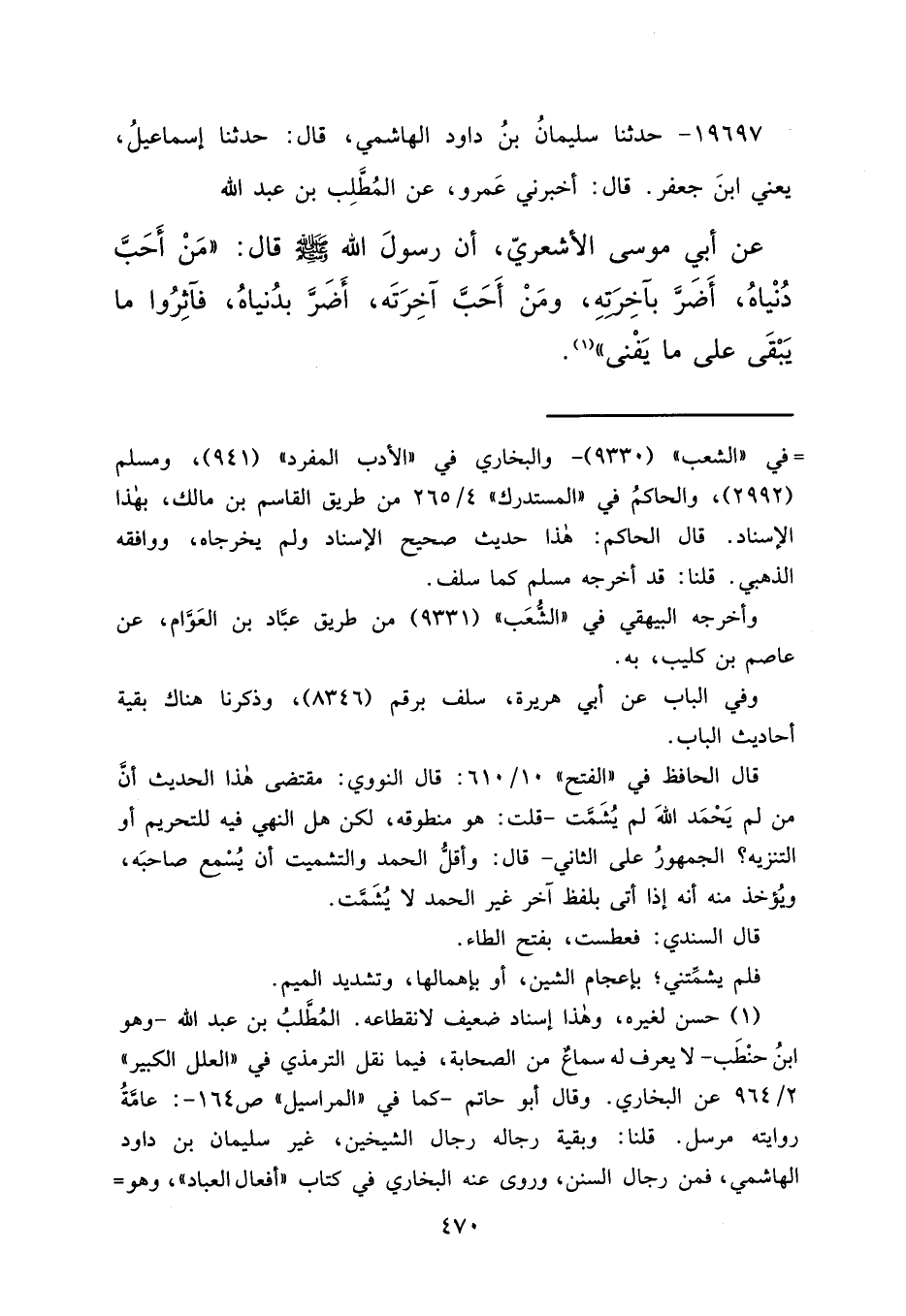 ١٩٦٩٧ - حَدَّثَنَا سُلَيْمَانُ بْنُ دَاوُدَ الْهَاشِمِيُّ قَالَ: حَدَّثَنَا إِسْمَاعِيلُ يَعْنِي ابْنَ جَعْفَرٍ قَالَ: أَخْبَرَنِي عَمْرٌو، عَنْ الْمُطَّلِبِ بْنِ عَبْدِ اللهِ، عَنْ أَبِي مُوسَى الْأَشْعَرِيِّ، أَنَّ رَسُولَ اللهِ صَلَّى اللهُ عَلَيْهِ وَسَلَّمَ قَالَ: " مَنْ أَحَبَّ دُنْيَاهُ أَضَرَّ بِآخِرَتِهِ، وَمَنْ أَحَبَّ آخِرَتَهُ أَضَرَّ بِدُنْيَاهُ، فَآثِرُوا مَا يَبْقَى عَلَى مَا يَفْنَى " (١)