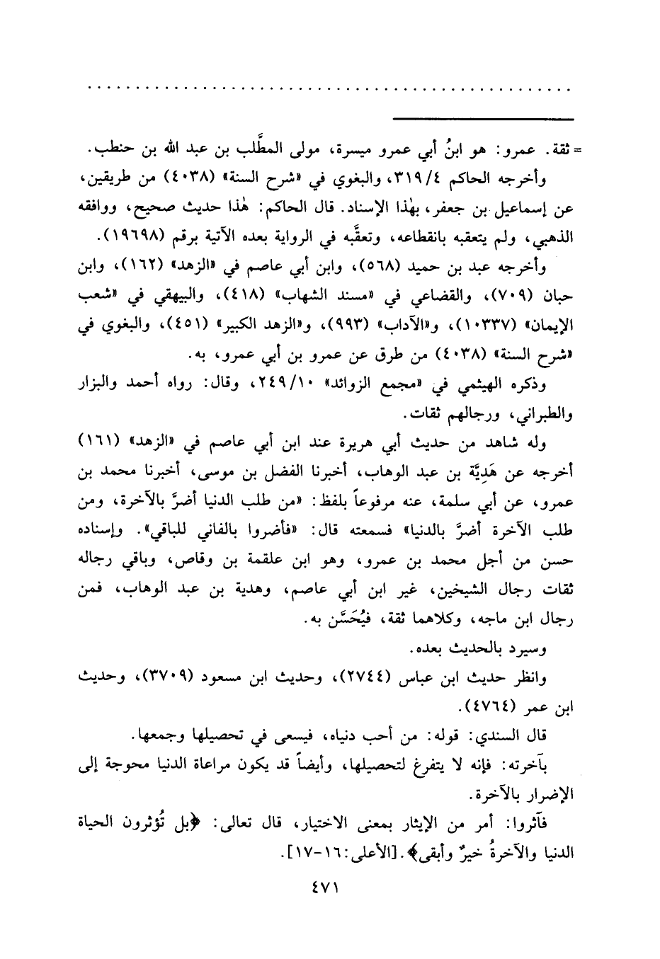 وله شاهد من حديث أبي هريرة عند ابن أبي عاصم في "الزهد" (١٦١) أخرجه عن هَدِيَّة بن عند الوهاب، أخبرنا الفضل بن موسى، أخبرنا محمد بن عمرو، عن أبي سلمة، عنه مرفوعاً بلفظ: "من طلب الدنيا أضرَ بالآخرة، ومن طلب الآخرة اضرَ بالدنيا" فسمعته قال: "فأضروا بالفاني للباقي". وإسناده حسن من أجل محمد بن عمرو، وهو ابن علقمة بن وقاص، وباقي رجاله ثقات رجال الشيخين، غير ابن أبي عاصم، وهدية بن عبد الوهاب، فمن رجال ابن ماجه، وكلاهما ثقة، فيُحَسَّن به.