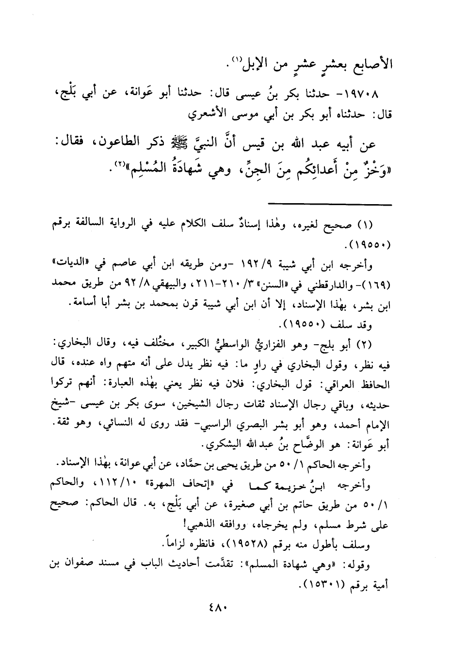 ١٩٧٠٨ - حَدَّثَنَا بَكْرُ بْنُ عِيسَى قَالَ: حَدَّثَنَا أَبُو عَوَانَةَ، عَنْ أَبِي بَلْجٍ قَالَ: حَدَّثَنَاهُ أَبُو بَكْرِ بْنُ أَبِي مُوسَى الْأَشْعَرِيُّ، عَنْ أَبِيهِ عَبْدِ اللهِ بْنِ قَيْسٍ، أَنَّ النَّبِيَّ صَلَّى اللهُ عَلَيْهِ وَسَلَّمَ " ذَكَرَ الطَّاعُونَ فَقَالَ: وَخْزٌ مِنْ أَعْدَائِكُمْ مِنَ الْجِنِّ، وَهِيَ شَهَادَةُ الْمُسْلِمِ " (٢)