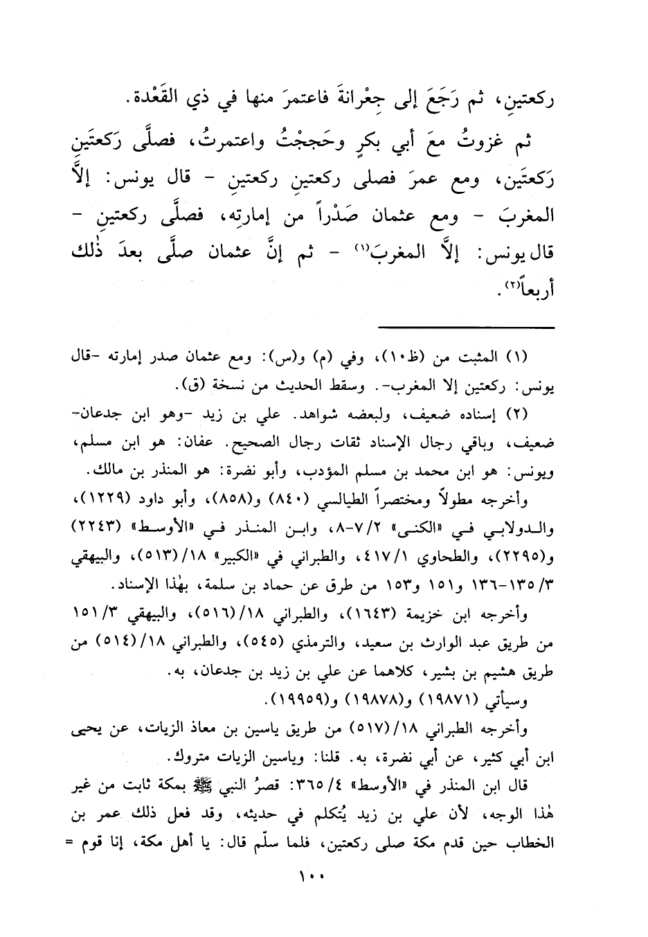 رَكْعَتَيْنِ، ثُمَّ رَجَعَ إِلَى جِعِرَّانَةَ فَاعْتَمَرَ مِنْهَا فِي ذِي الْقَعْدَةِ، ثُمَّ غَزَوْتُ مَعَ أَبِي بَكْرٍ وَحَجَجْتُ وَاعْتَمَرْتُ، فَصَلَّى رَكْعَتَيْنِ رَكْعَتَيْنِ، وَمَعَ عُمَرَ فَصَلَّى رَكْعَتَيْنِ رَكْعَتَيْنِ، قَالَ يُونُسُ: إِلَّا الْمَغْرِبَ، وَمَعَ عُثْمَانَ صَدْرًا مِنْ إِمَارَتِهِ فَصَلَّى رَكْعَتَيْنِ، قَالَ يُونُسُ: إِلَّا الْمَغْرِبَ، (١) ثُمَّ إِنَّ عُثْمَانَ صَلَّى بَعْدَ ذَلِكَ أَرْبَعًا (٢)
