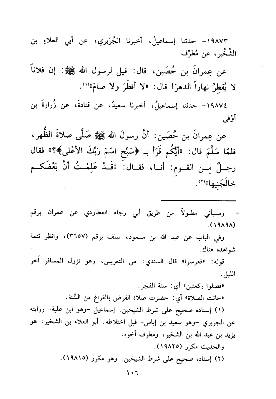 ١٩٨٧٣ - حَدَّثَنَا إِسْمَاعِيلُ، أَخْبَرَنَا الْجُرَيْرِيُّ، عَنْ أَبِي الْعَلَاءِ بْنِ الشِّخِّيرِ، عَنْ مُطَرِّفٍ، عَنْ عِمْرَانَ بْنِ حُصَيْنٍ قَالَ: قِيلَ لِرَسُولِ اللهِ صَلَّى اللهُ عَلَيْهِ وَسَلَّمَ إِنَّ فُلَانًا لَا يُفْطِرُ نَهَارًا الدَّهْرَ. قَالَ: " لَا أَفْطَرَ وَلَا صَامَ " (١)