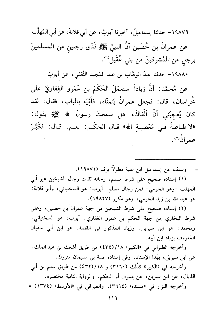 ١٩٨٨٠ - حَدَّثَنَا عَبْدُ الْوَهَّابِ بْنُ عَبْدِ الْمَجِيدِ الثَّقَفِيُّ، عَنْ أَيُّوبَ، عَنْ مُحَمَّدٍ، أَنَّ زِيَادًا اسْتَعْمَلَ الْحَكَمَ بْنَ عَمْرٍو الْغِفَارِيَّ عَلَى خُرَاسَانَ قَالَ: فَجَعَلَ عِمْرَانُ يَتَمَنَّاهُ فَلَقِيَهُ بِالْبَابِ فَقَالَ: لَقَدْ كَانَ يُعْجِبُنِي أَنْ أَلْقَاكَ. هَلْ سَمِعْتَ رَسُولَ اللهِ صَلَّى اللهُ عَلَيْهِ وَسَلَّمَ يَقُولُ: " لَا طَاعَةَ فِي مَعْصِيَةِ اللهِ "؟ قَالَ الْحَكَمُ: نَعَمْ. قَالَ: فَكَبَّرَ عِمْرَانُ (٢)