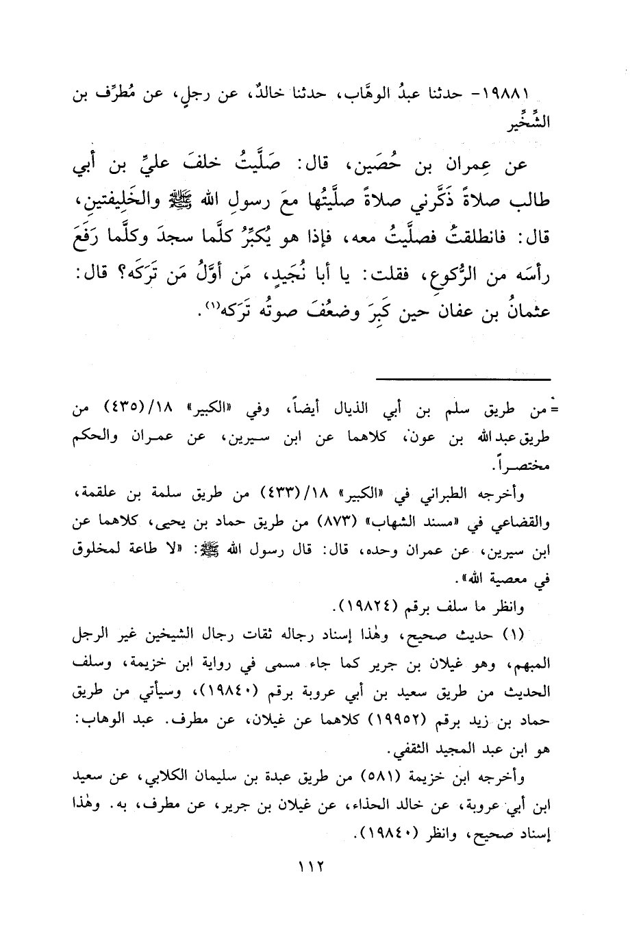 ١٩٨٨١ - حَدَّثَنَا عَبْدُ الْوَهَّابِ، حَدَّثَنَا خَالِدٌ، عَنْ رَجُلٍ، عَنْ مُطَرِّفِ بْنِ الشِّخِّيرِ، عَنْ عِمْرَانَ بْنِ حُصَيْنٍ قَالَ: " صَلَّيْتُ خَلْفَ عَلِيِّ بْنِ أَبِي طَالِبٍ صَلَاةً ذَكَّرَنِي صَلَاةً صَلَّيْتُهَا مَعَ رَسُولِ اللهِ صَلَّى اللهُ عَلَيْهِ وَسَلَّمَ وَالْخَلِيفَتَيْنِ. قَالَ: فَانْطَلَقْتُ فَصَلَّيْتُ مَعَهُ، فَإِذَا هُوَ يُكَبِّرُ كُلَّمَا سَجَدَ وَكُلَّمَا رَفَعَ رَأْسَهُ مِنَ الرُّكُوعِ. فَقُلْتُ يَا أَبَا نُجَيْدٍ: مَنْ أَوَّلُ مَنْ تَرَكَهُ؟ قَالَ: عُثْمَانُ بْنُ عَفَّانَ حِينَ كَبِرَ وَضَعُفَ صَوْتُهُ تَرَكَهُ " (١)
